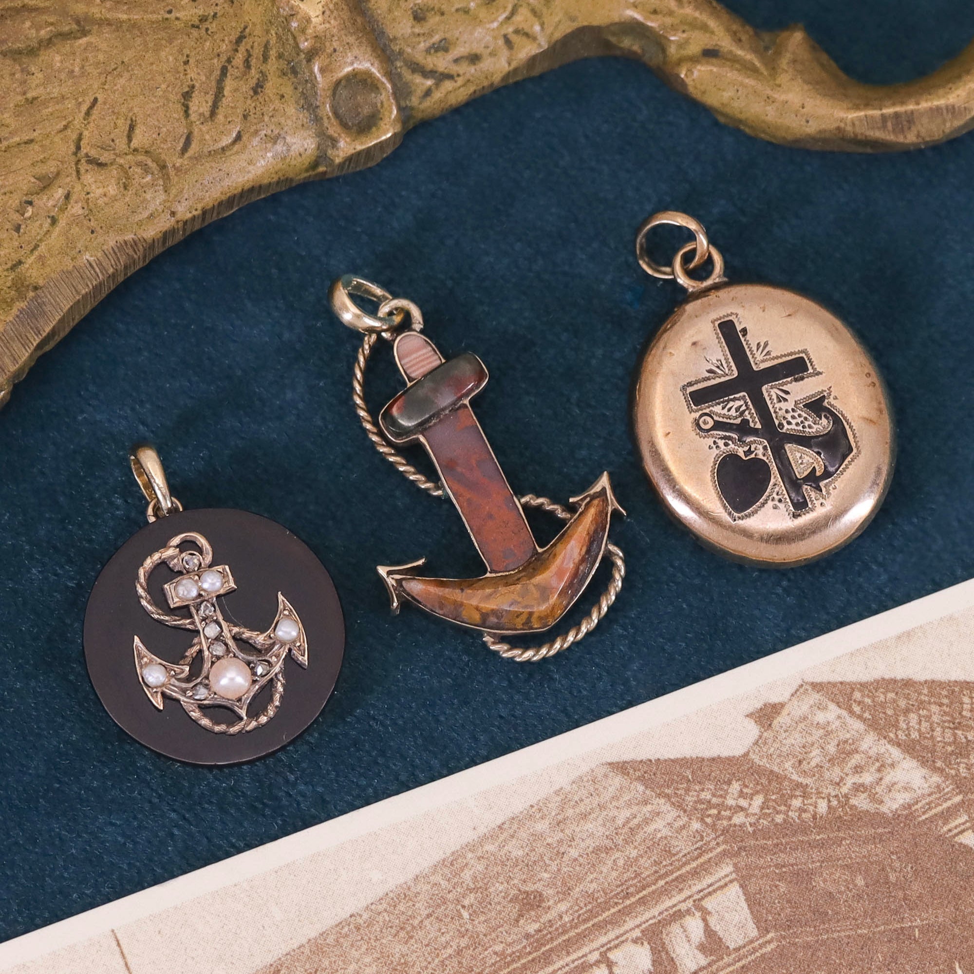 A timeless emblem of hope and steadfastness, this antique anchor pendant is carved from richly hued agate and framed in 9ct gold. With its bold yet graceful silhouette, the piece speaks to Victorian-era symbolism while offering a modern elegance that transcends time.