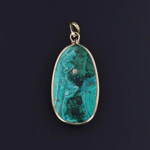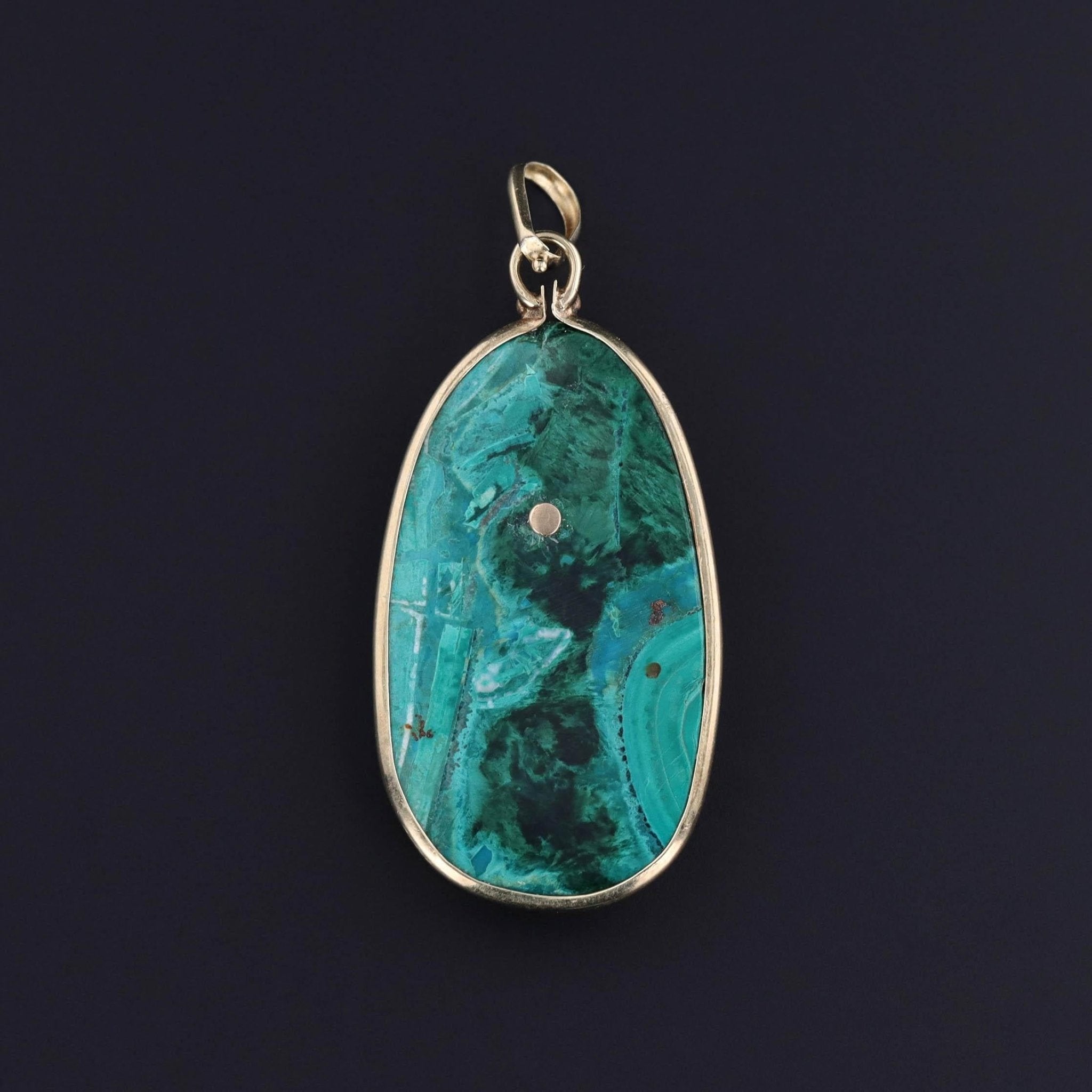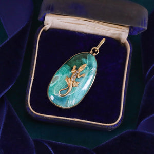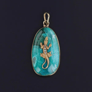 This striking pendant is a masterclass in combining antique charm with mid-century elegance. At its heart lies a richly patterned green malachite cabochon, its natural striations providing a vivid backdrop for a finely detailed gold lizard. The reptile, an antique treasure from 1890, is adorned with glittering rose cut diamonds that catch the light with every movement. The piece is framed in warm 14k gold, a vintage mounting dating to the 1960s, creating a seamless fusion of two distinct eras.