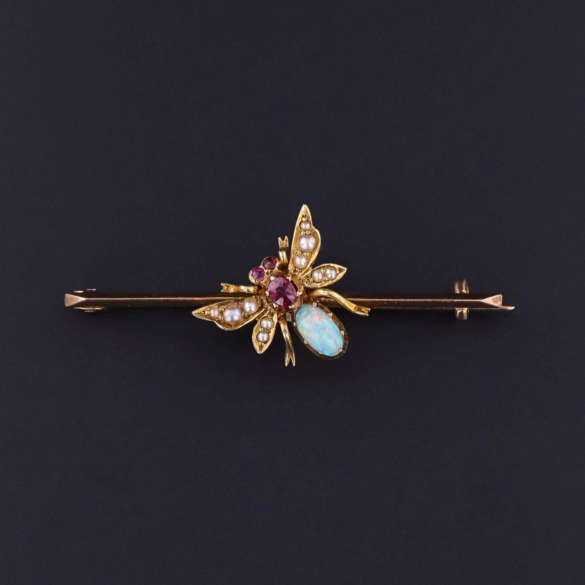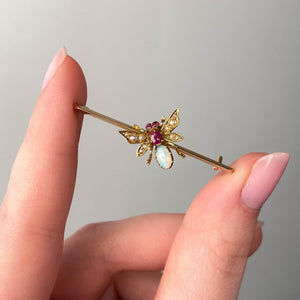 A charming Victorian era bar pin from 1890-1900, centered with a finely rendered insect motif, set with a crystal opal body, vibrant natural ruby accents, and delicately arranged split seed pearls. The interplay of iridescent opal and richly saturated rubies creates lively contrast, while the seed pearls lend softness and period authenticity. Insect jewelry was especially beloved in the late 19th century, symbolizing transformation, vitality, and the beauty of the natural world.