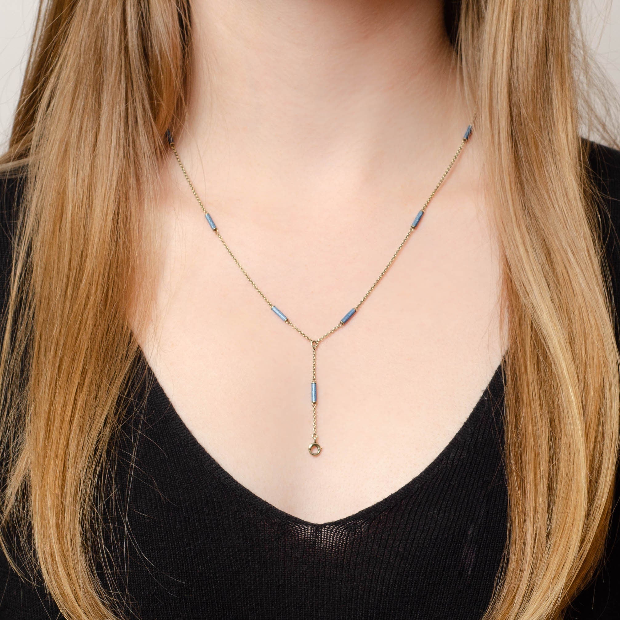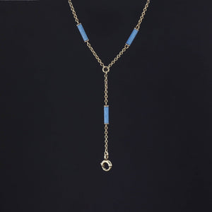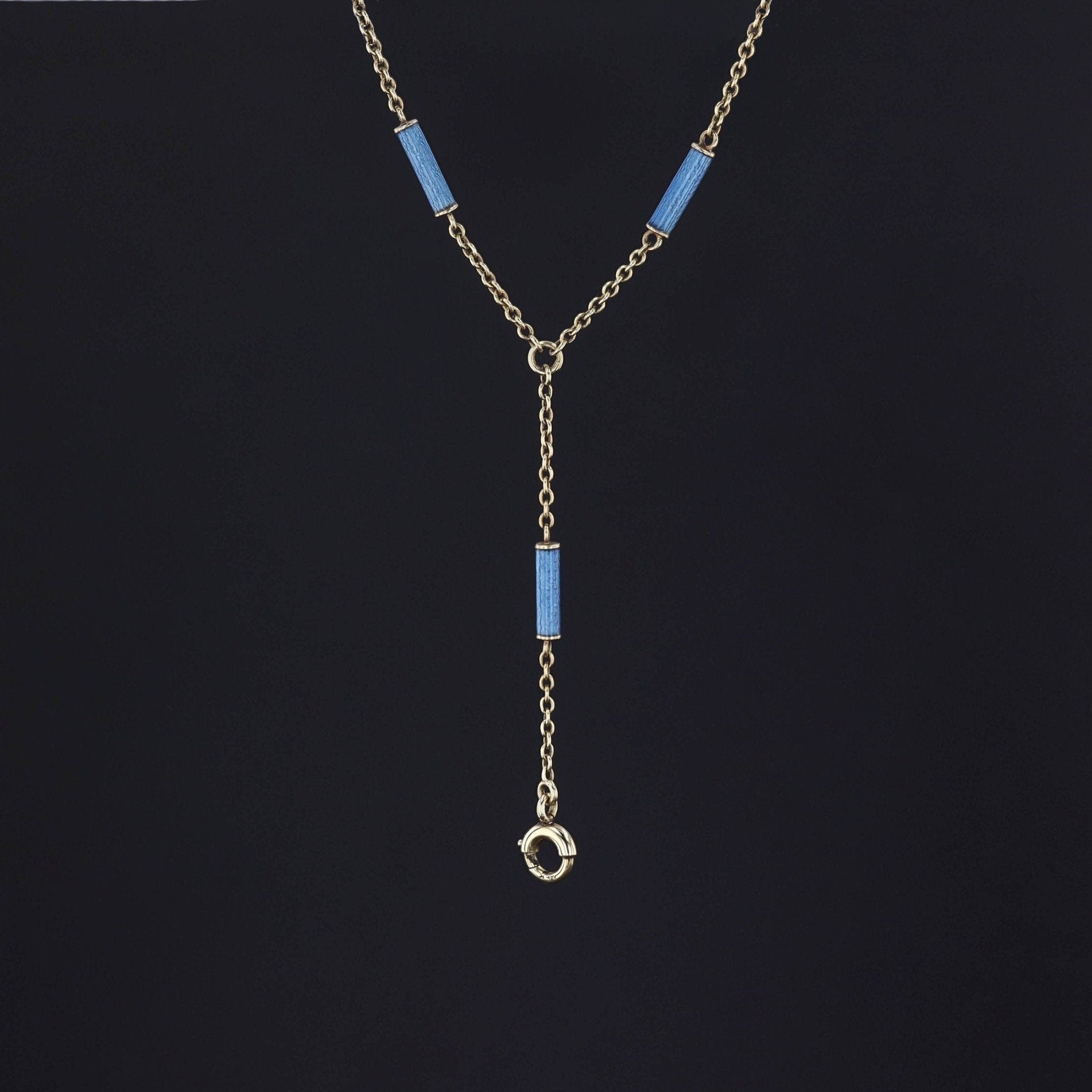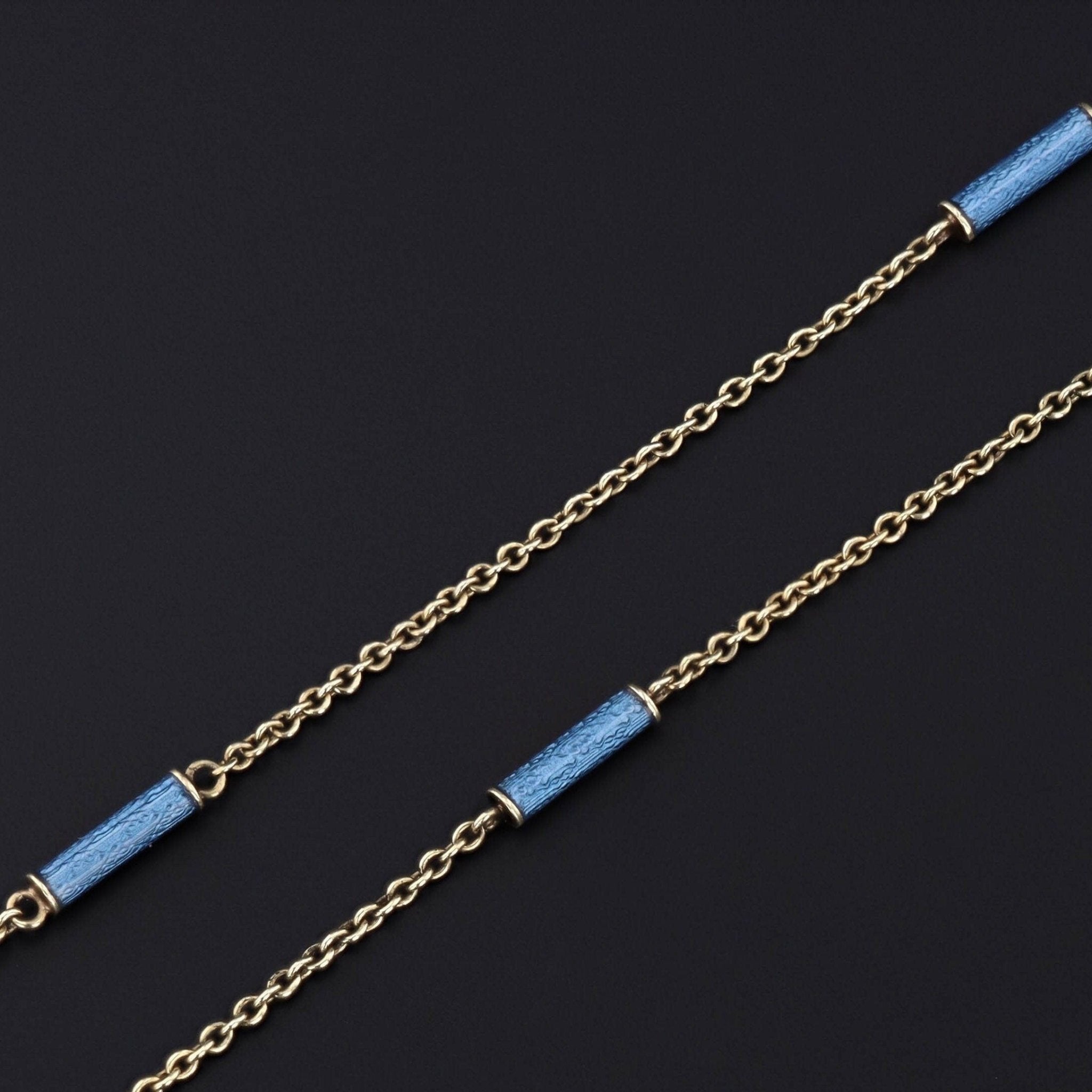 An exquisite example of early 20th-century craftsmanship, this antique necklace (circa 1910) features seven guilloché enamel links, each rendered in a luminous blue color and framed in solid 14k gold. The intricate enamel work showcases the delicate wave-like engine-turned pattern typical of fine guilloché technique, lending the piece both texture and radiance.