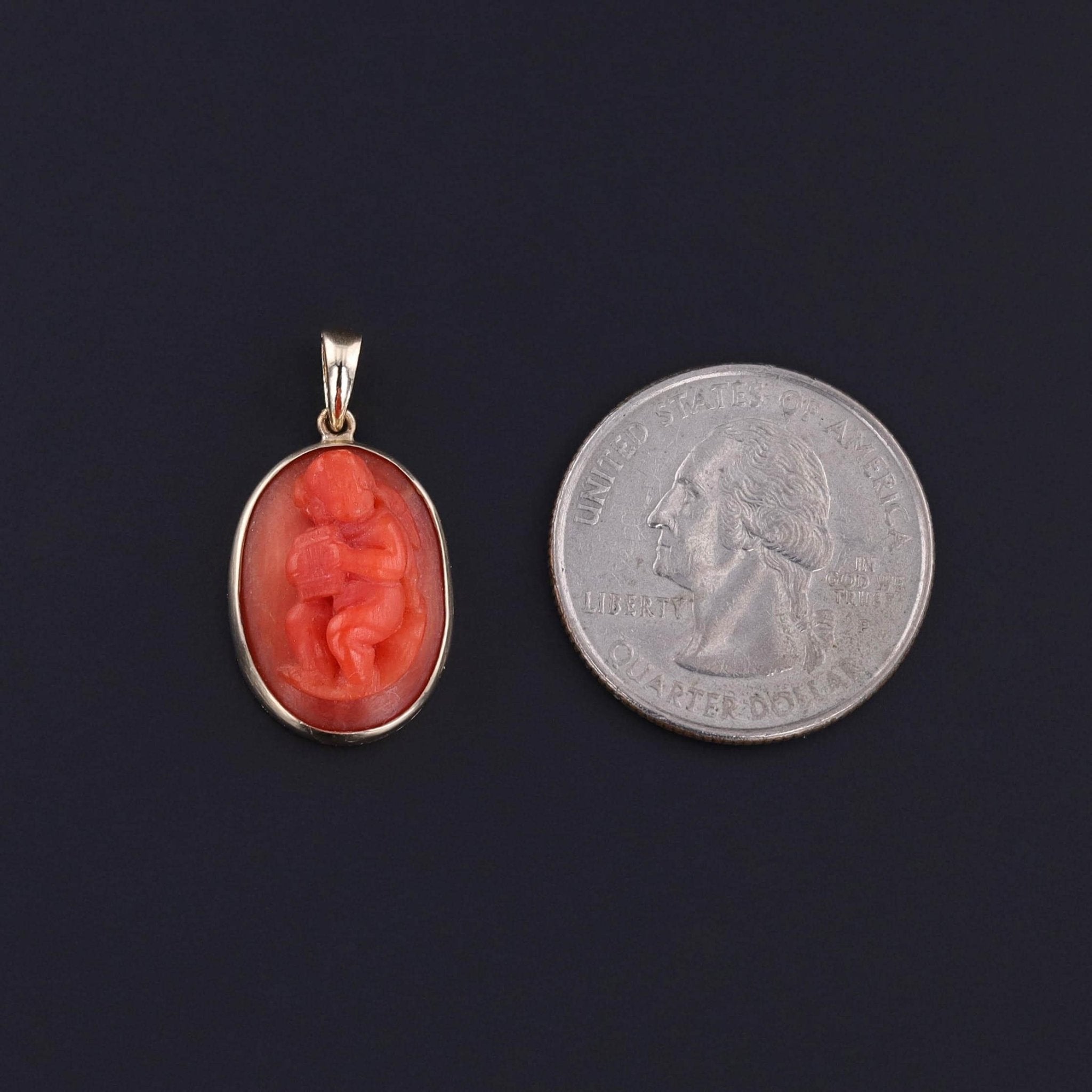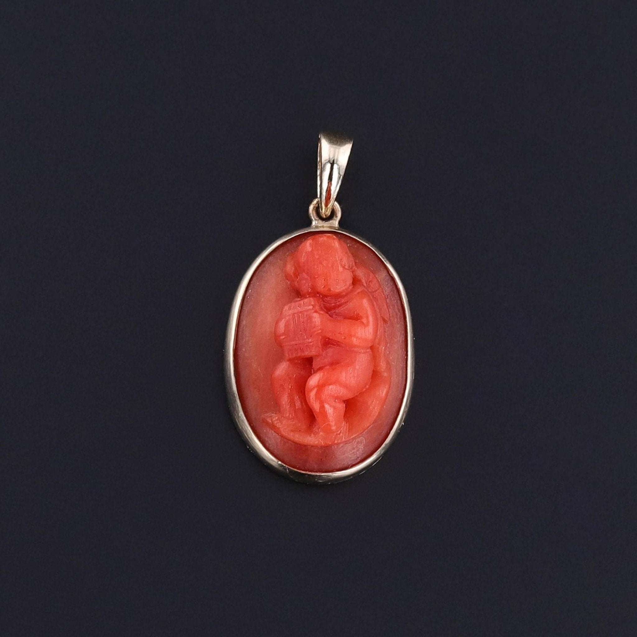 Delicate and ethereal, this antique pendant (circa 1880) features a finely carved coral cameo of a cherub, set in an elegant 14k gold frame. The cherub—symbolizing innocence, protection, and divine love—is rendered with soft detail, capturing the romanticism and sentimentality of the late Victorian era.
