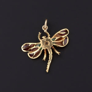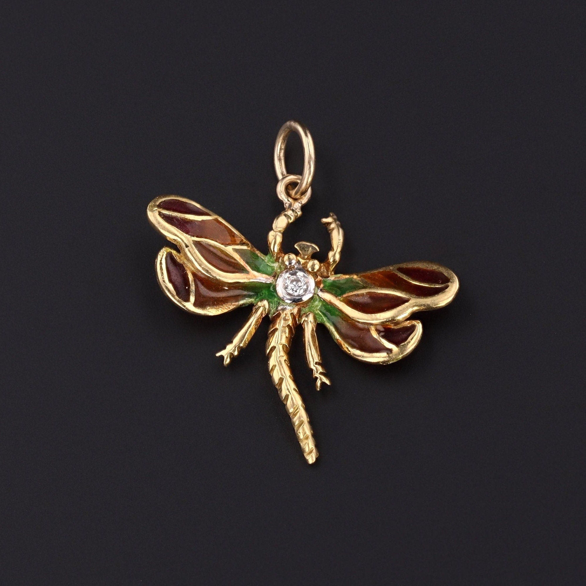 This elegant dragonfly pendant (circa 1910-1920) is 18k gold with plique-a-jour enamel wings and a diamond accent at its center.