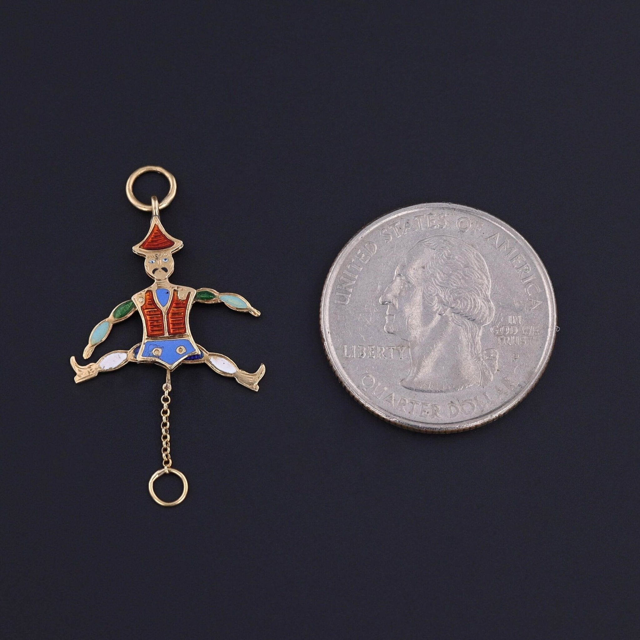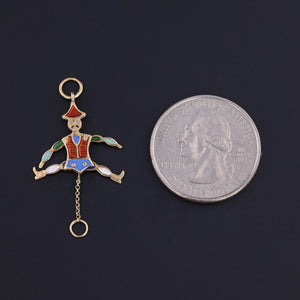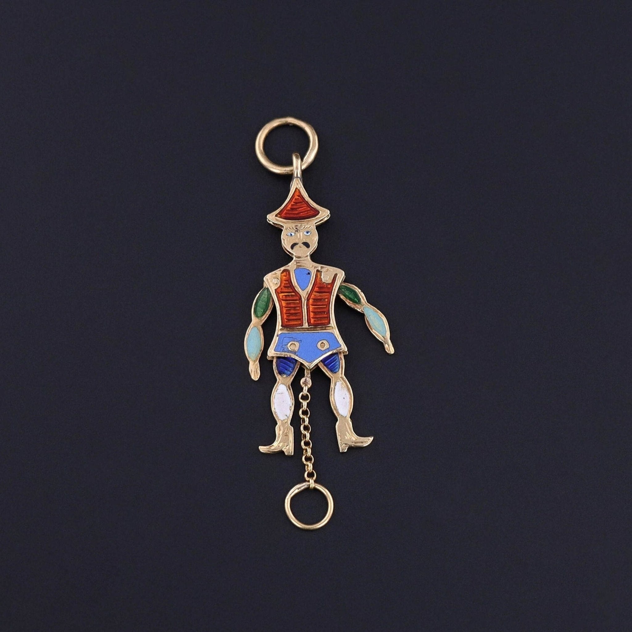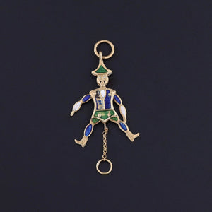 A rare and whimsical treasure from the Victorian era, this antique French charm (circa 1870) is a delightful example of 19th-century ingenuity and craftsmanship. Expertly crafted in 18k gold, it features a finely enameled double-sided figure of a man whose arms and legs lift when the chain is pulled, showcasing the playful mechanical creativity that captivated jewelers and collectors of the era.