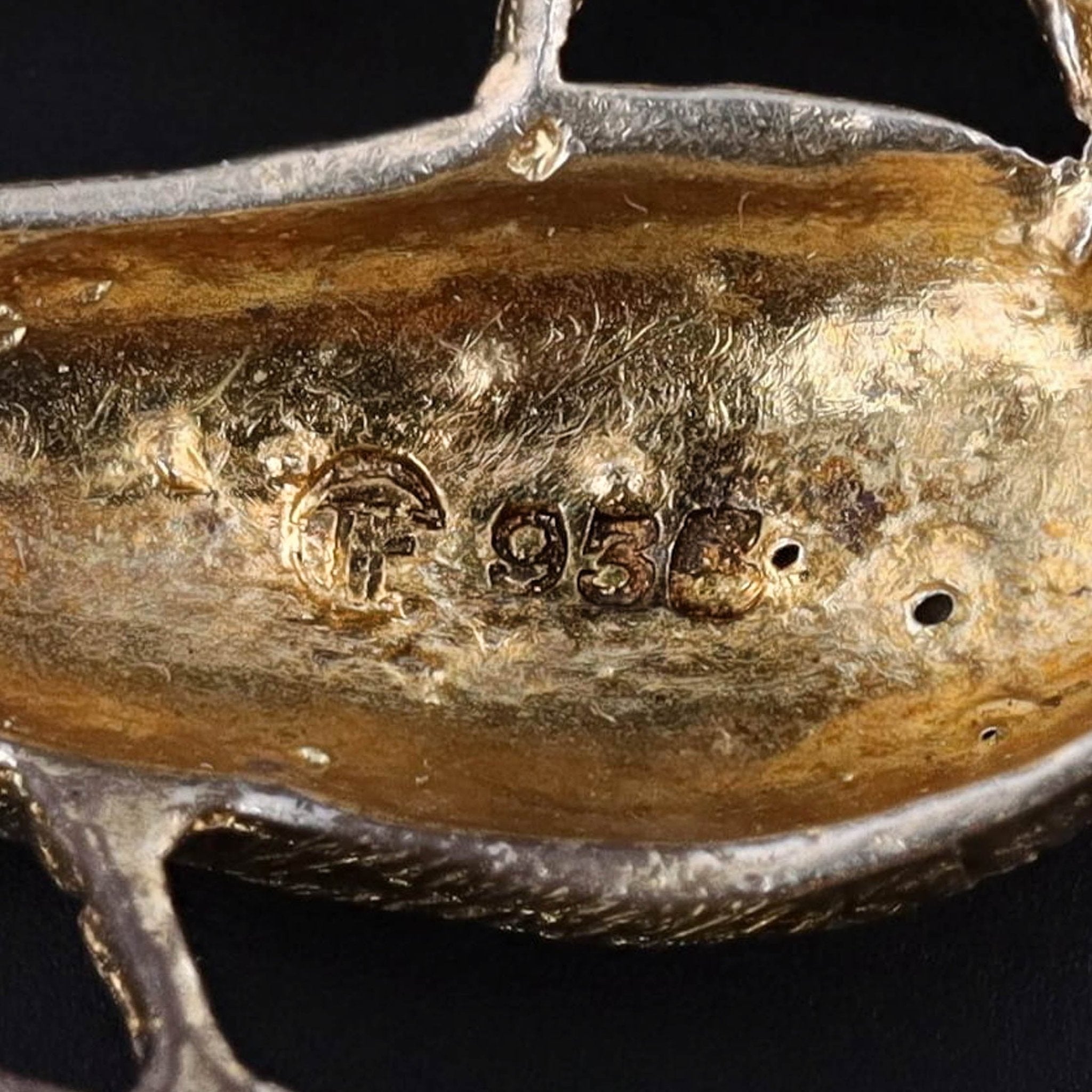 The piece is crafted in gold-washed sterling silver and measures 1.3 inches from the top of the jump ring to the base by 1 inch across. The metal content has been confirmed through XRF (x-ray fluorescence) analysis and traditional jeweler’s acid testing, ensuring authenticity.
