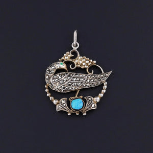 This antique pendant (circa 1900–1910) features a beautifully detailed peacock, its plumage adorned with glittering marcasites and its body set with a luminous opal doublet. The jewel captures the elegance of Edwardian and Art Nouveau design, when peacocks were celebrated as symbols of beauty, immortality, and renewal.