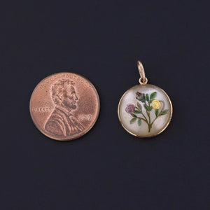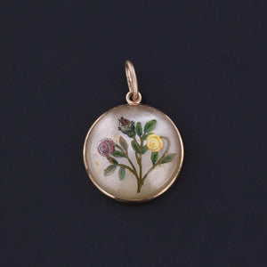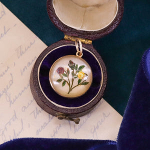 Embodying the artistry and charm of the late Victorian era, this antique pendant (circa 1880–1900) features a delicate reverse carved and hand-painted crystal flower, set in a finely crafted 14k gold bezel. The technique of reverse intaglio carving — painstakingly executed from the underside of the crystal — creates a miniature jewel-like painting that comes to life with remarkable depth and detail.