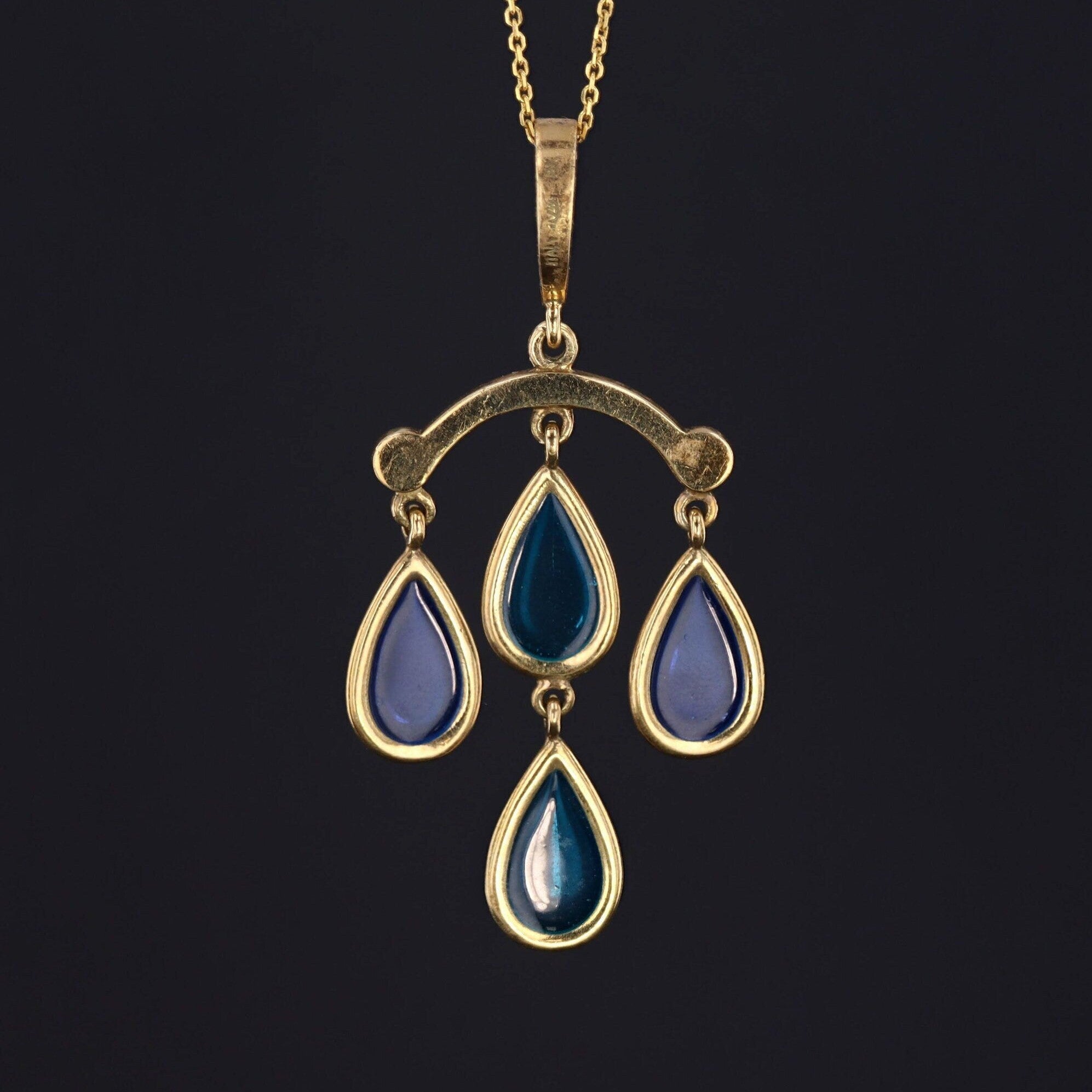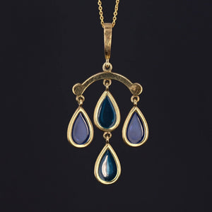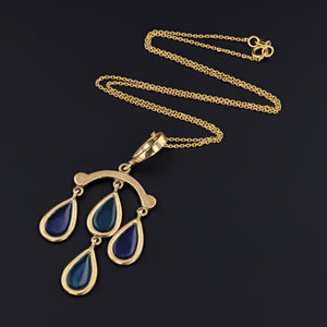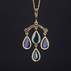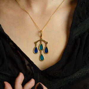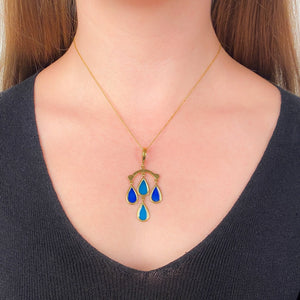 The pendant features a chandelier-like cascade of translucent blue plique-à-jour enamel teardrops, each meticulously suspended within a framework of rich 18k gold. The result is a luminous, stained-glass effect that dances with light and movement — a hallmark of Frascarolo’s most sought-after creations.