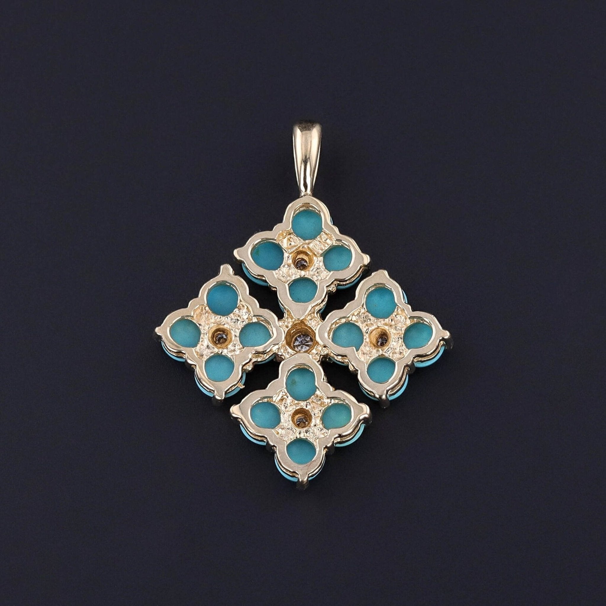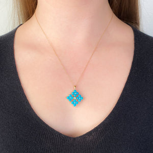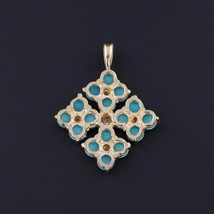 This eye-catching vintage pendant, crafted in 14k gold circa 1980–1990, features a striking arrangement of vibrant turquoise cabochons accented by sparkling diamonds, creating a bold yet elegant statement. The vivid blue of the turquoise contrasts beautifully with the brilliance of the diamonds, resulting in a piece that is both timeless and full of personality.