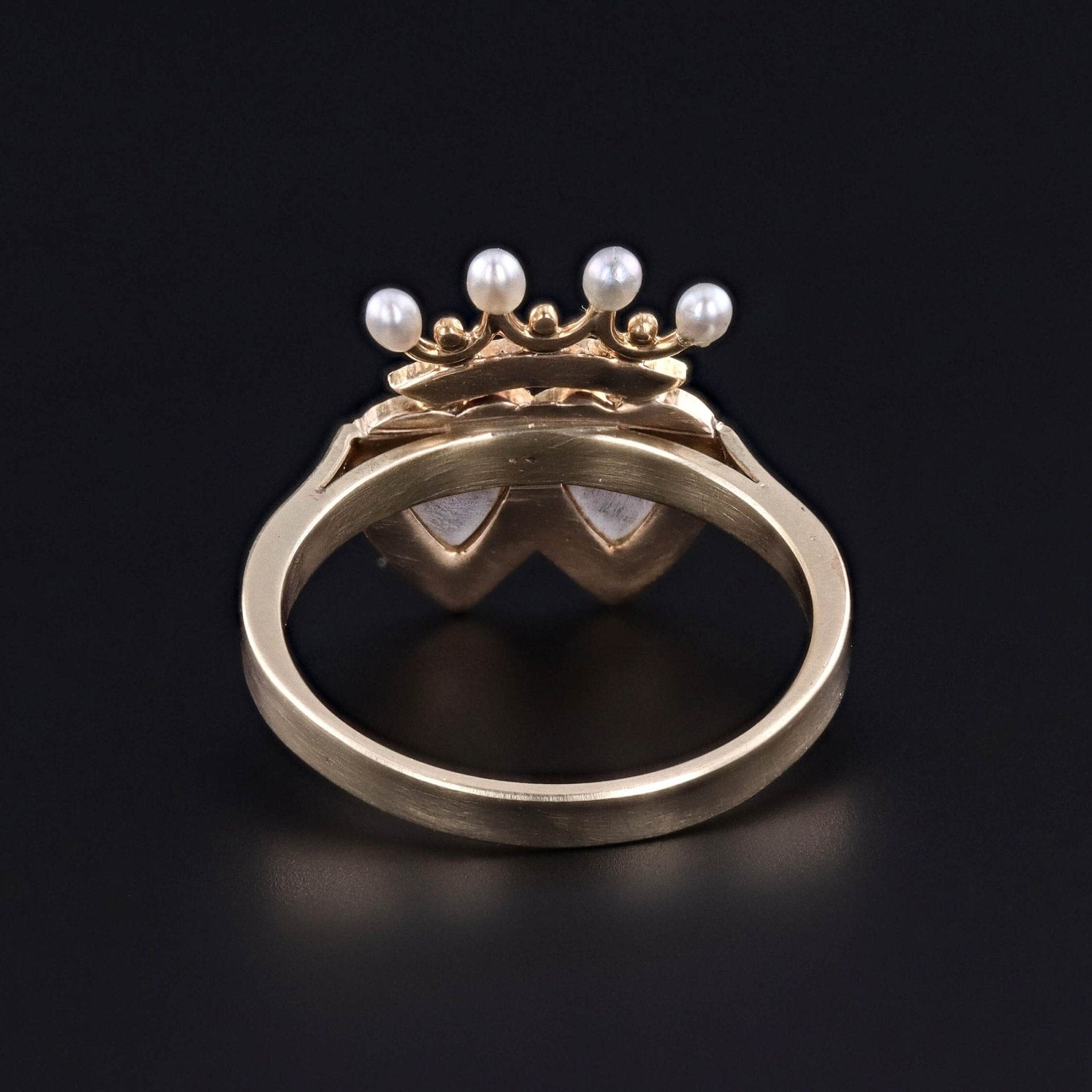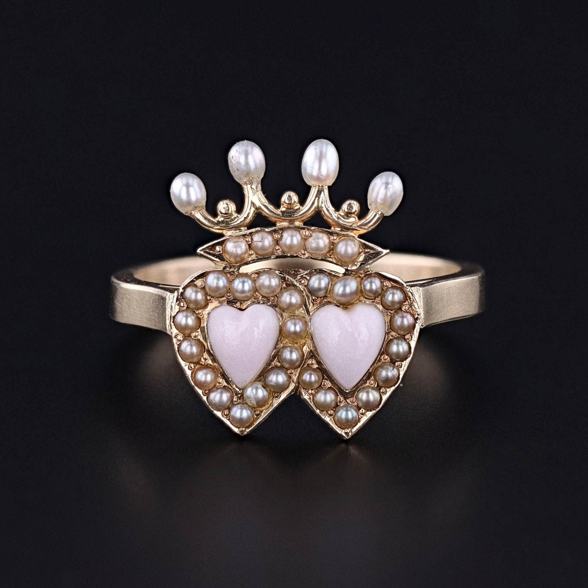 The face of this gorgeous ring was originally an antique stickpin (circa 1880–1900), thoughtfully transformed with a newly made custom 14k gold mounting. The design features two hearts carved in a delicate pink-hued coral, framed by tiny half pearls, and surmounted by a crown adorned with additional half pearls and four post-set pearls. Together, the crowned hearts symbolize enduring love, loyalty, and devotion—sentiments that made this motif especially cherished during the Victorian era.
