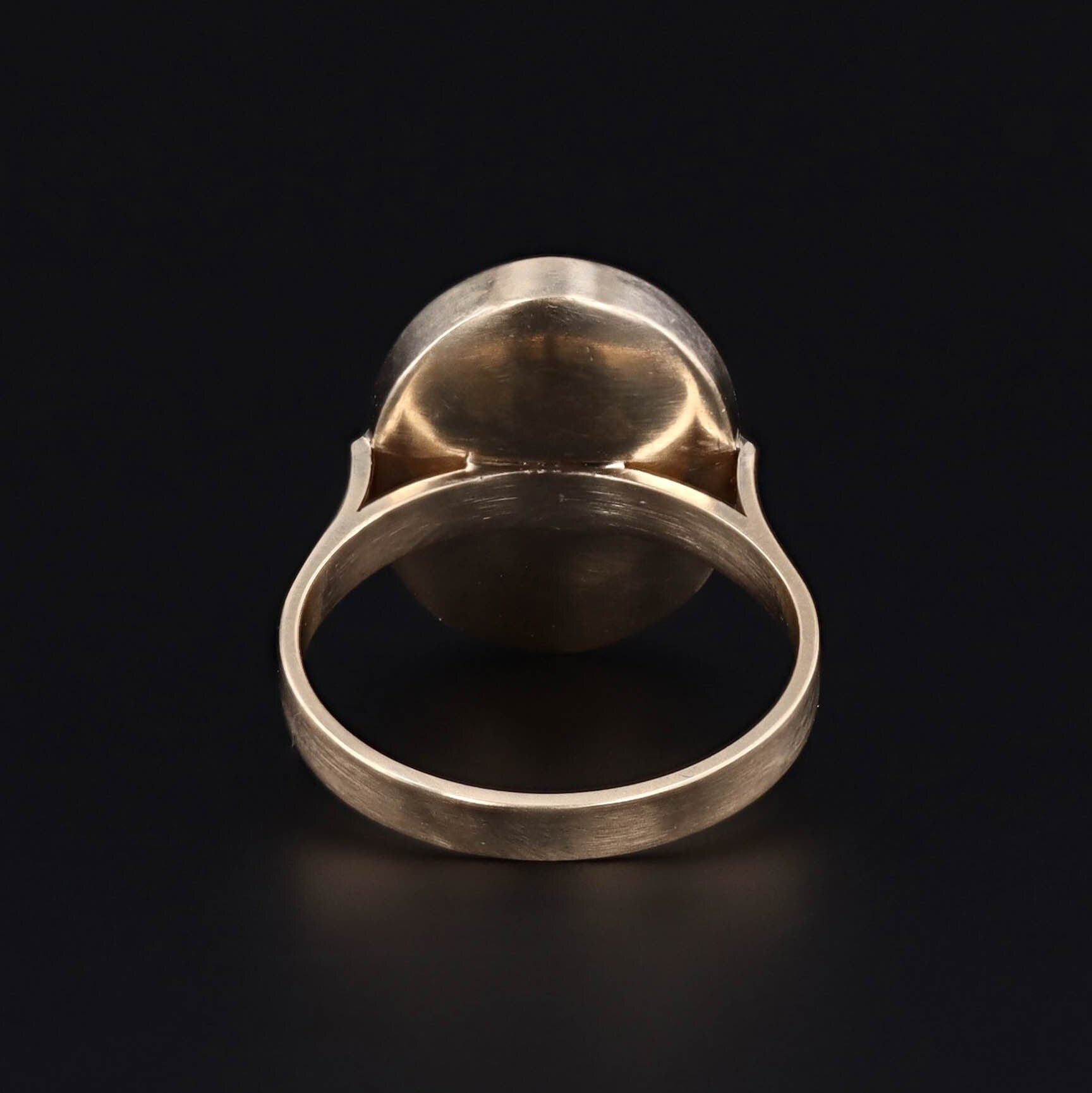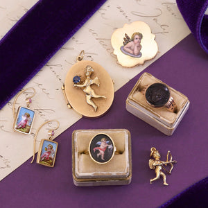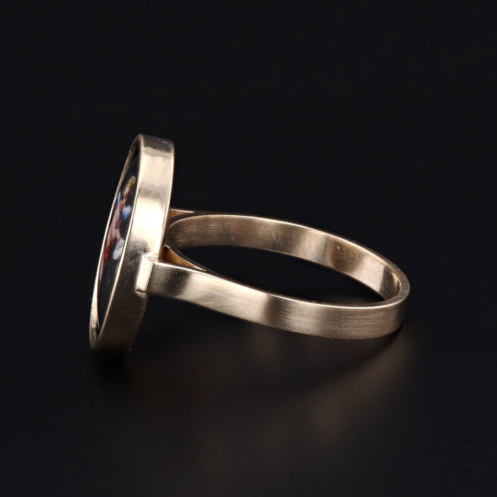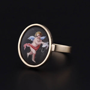 This romantic 14k gold ring showcases a finely detailed enamel portrait of a cherub tenderly holding a dove — a timeless symbol of peace and love. The face of the ring originated as an antique pin (circa 1890) and was thoughtfully transformed by our jeweler, who removed the original pin findings and mounted it onto a custom-crafted 14k gold band.