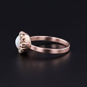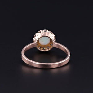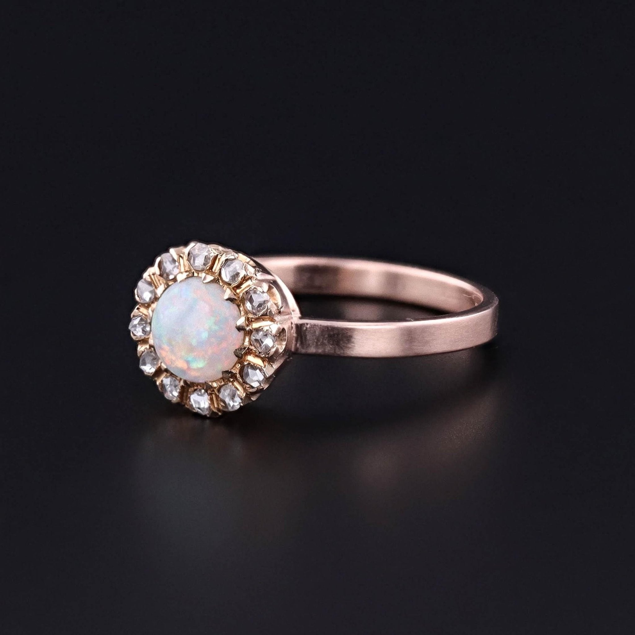 This elegant ring centers on a luminous white opal framed by a halo of glittering rose cut diamonds, all set in warm 14k gold. The opal’s shifting play of color contrasts beautifully with the subtle sparkle of the antique-cut stones, creating a refined and timeless composition.