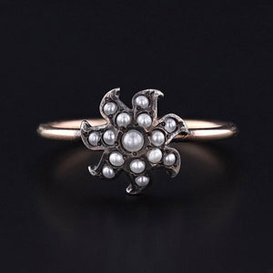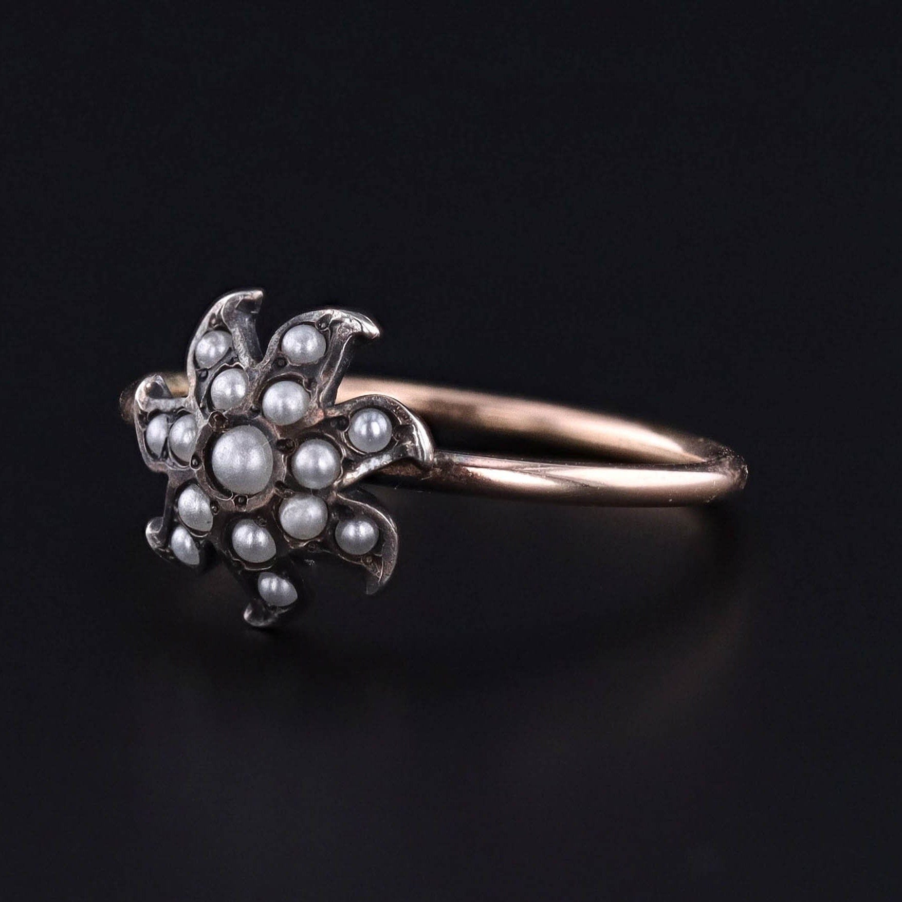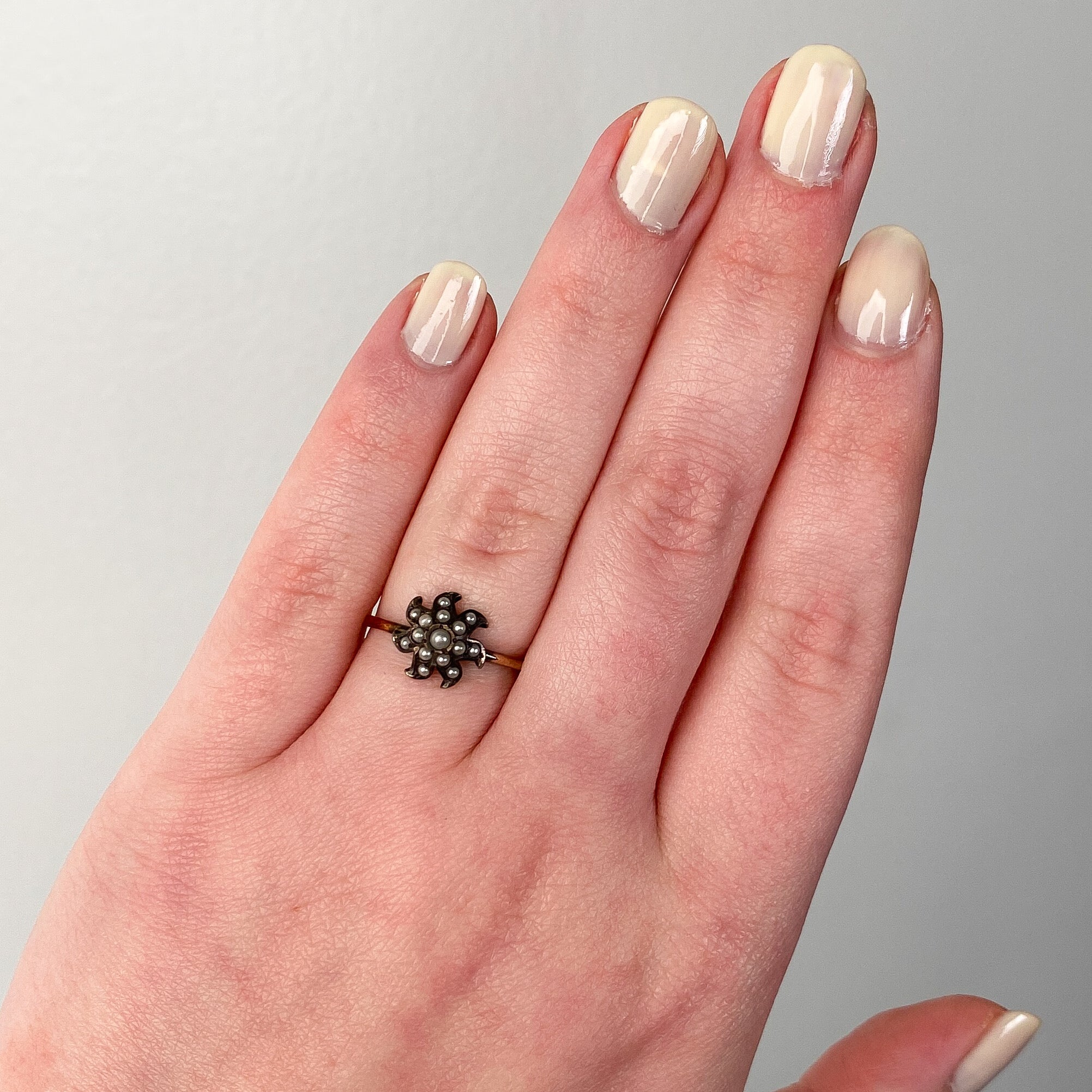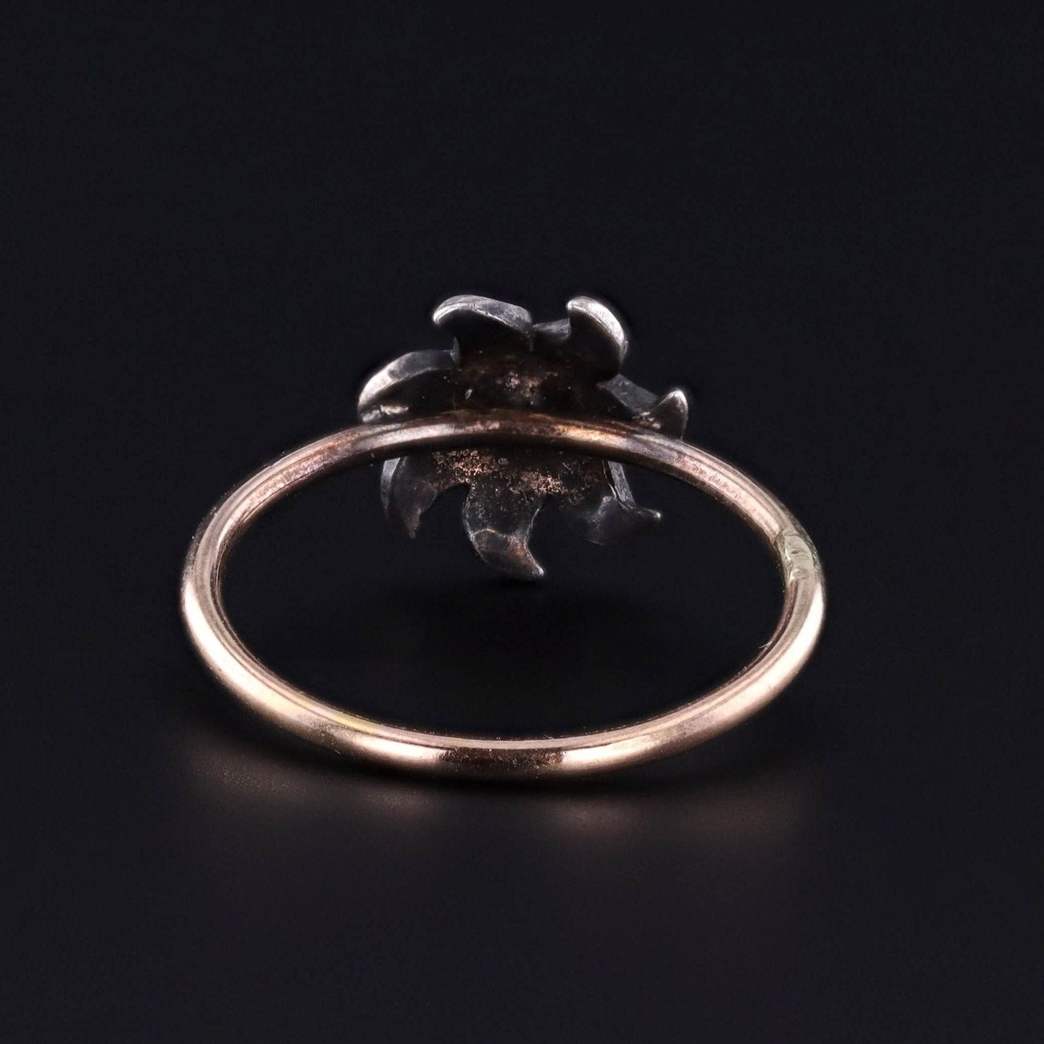 Elegant in its simplicity, this conversion ring was created from an antique stickpin, reimagined into a wearable jewel with timeless style. The design features a silver sunburst motif, radiating energy and light, accented with delicate simulated half pearls that lend a soft luster. The motif is mounted on a classic 10k gold band, blending antique charm with modern minimalism.