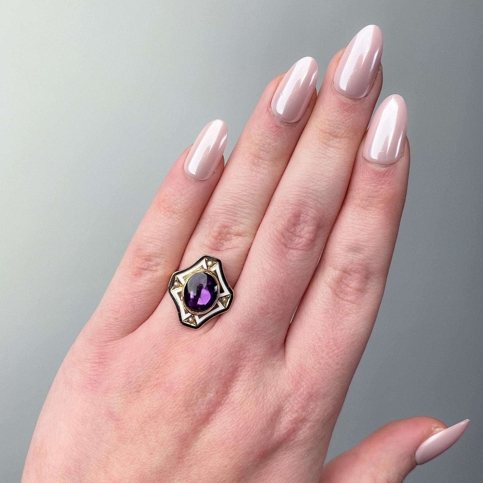 This striking Art Deco ring (circa 1920–1930) showcases a vivid purple foil-backed synthetic sapphire, accented with black and white enamel and framed by four luminous half pearls. The bold geometric lines and contrasting colors exemplify the dramatic design sensibilities of the Deco era.