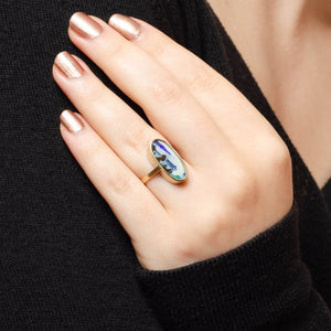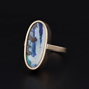 Captivating and full of natural wonder, this boulder opal ring showcases a striking stone with a white matrix illuminated by vivid flashes of electric blue. The opal, sourced loose, was thoughtfully mounted by our jeweler in a sleek 14k gold setting, allowing its play of color to take center stage.
