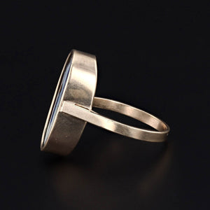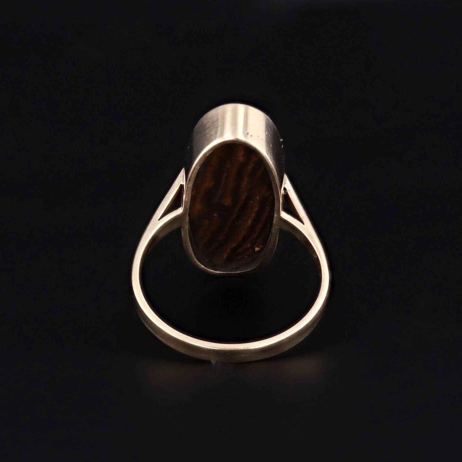 The face of the ring measures approximately 0.8 inches by 0.4 inches wide, balancing bold presence with elegant proportions. It is currently a size 6.25, though it may be resized for an additional charge. The ring remains in excellent condition, with the opal securely set and the gold finely finished.