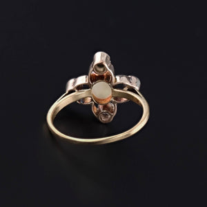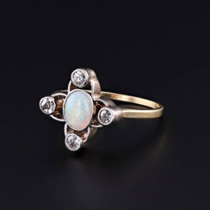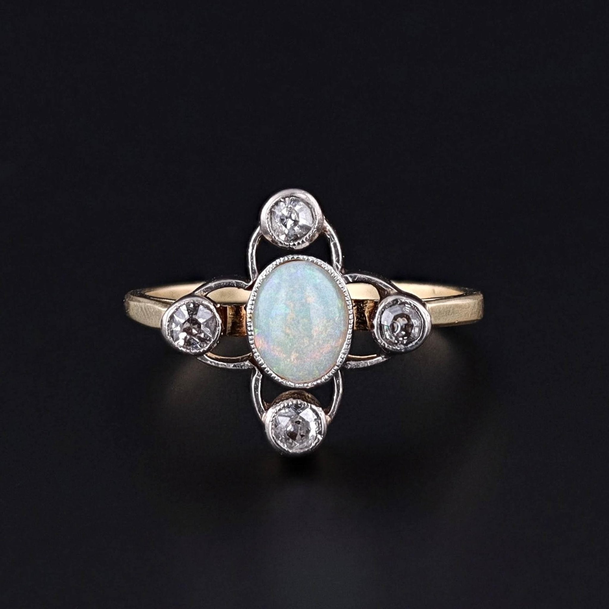 This luminous ring centers on a glowing opal, its shifting play of color enhanced by the sparkle of four old single cut diamonds delicately set in palladium. The result is a jewel that captures both the ethereal beauty of opal and the timeless elegance of antique diamonds.