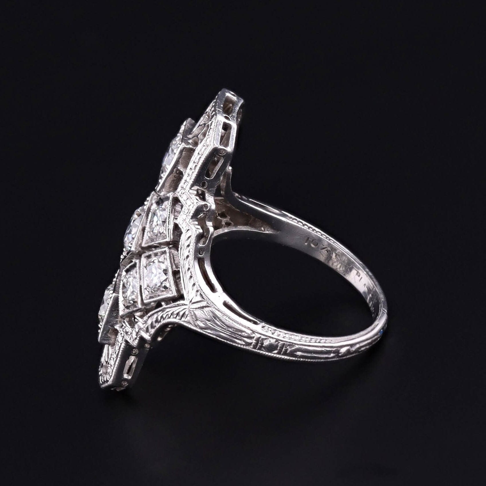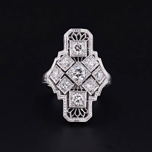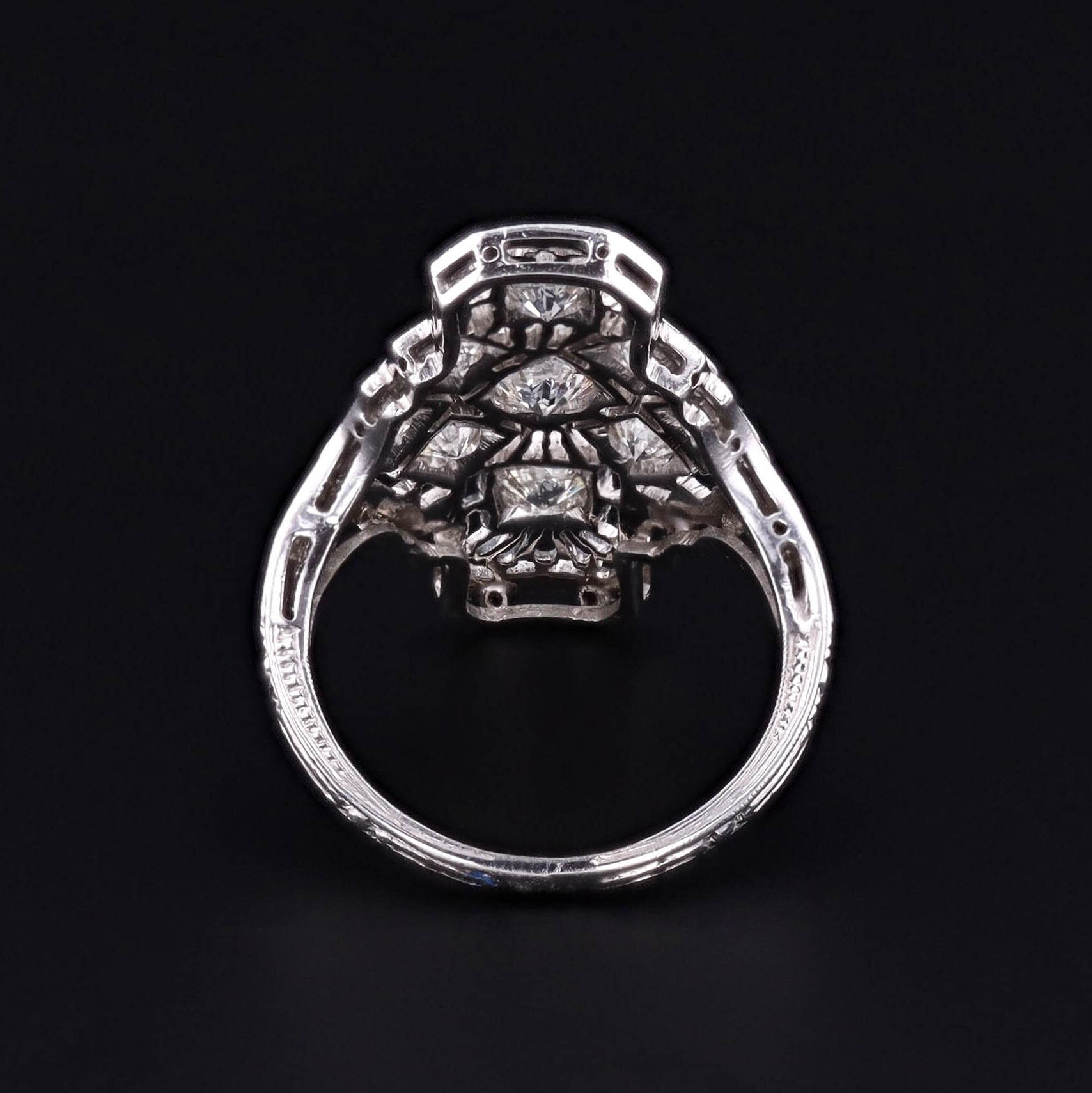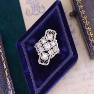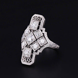 A dazzling example of 1920s sophistication, this Art Deco era ring features a graceful platinum filigree mounting, aglitter with nine high-quality diamonds totaling approximately 1.05 carats. The design exemplifies the geometric elegance and meticulous craftsmanship of the Jazz Age, offering timeless sparkle with collector-grade detail.