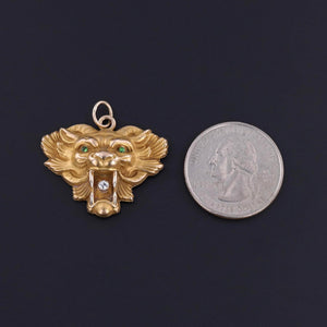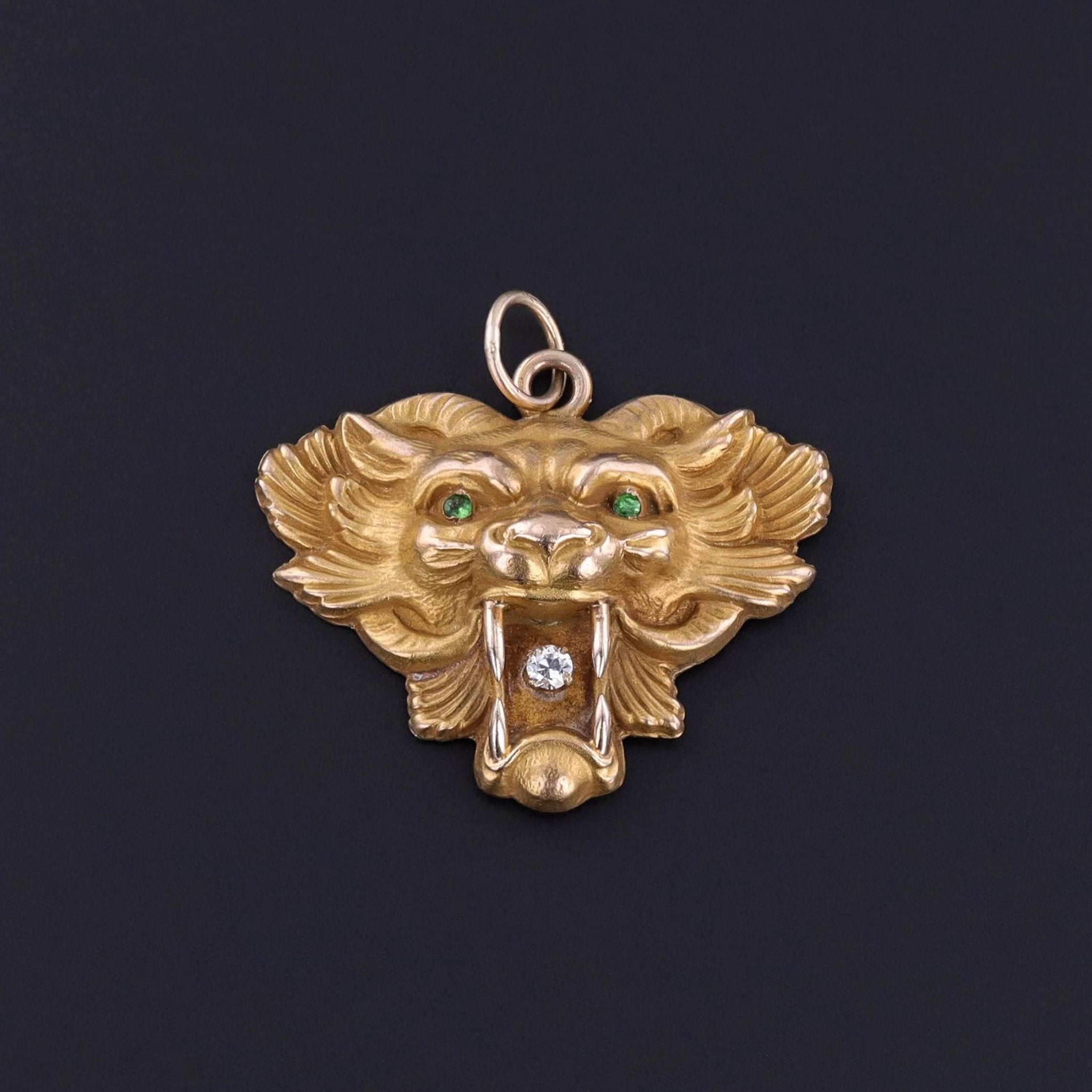 Antique Lion Pendant: This 10k gold pendant (circa 1910) features a lion's head with an outstretched mane clutching a diamond in its jaws.