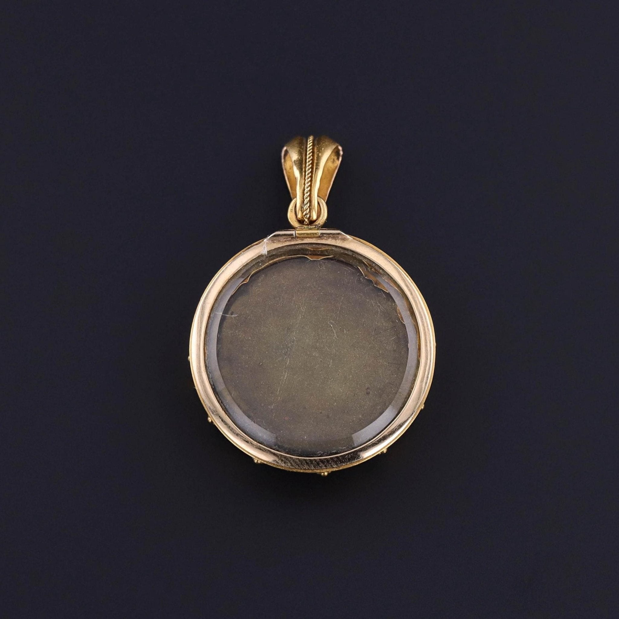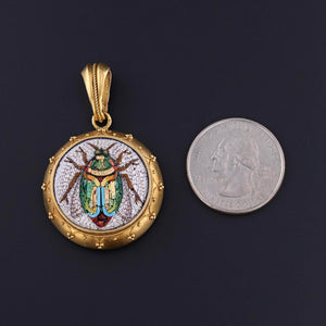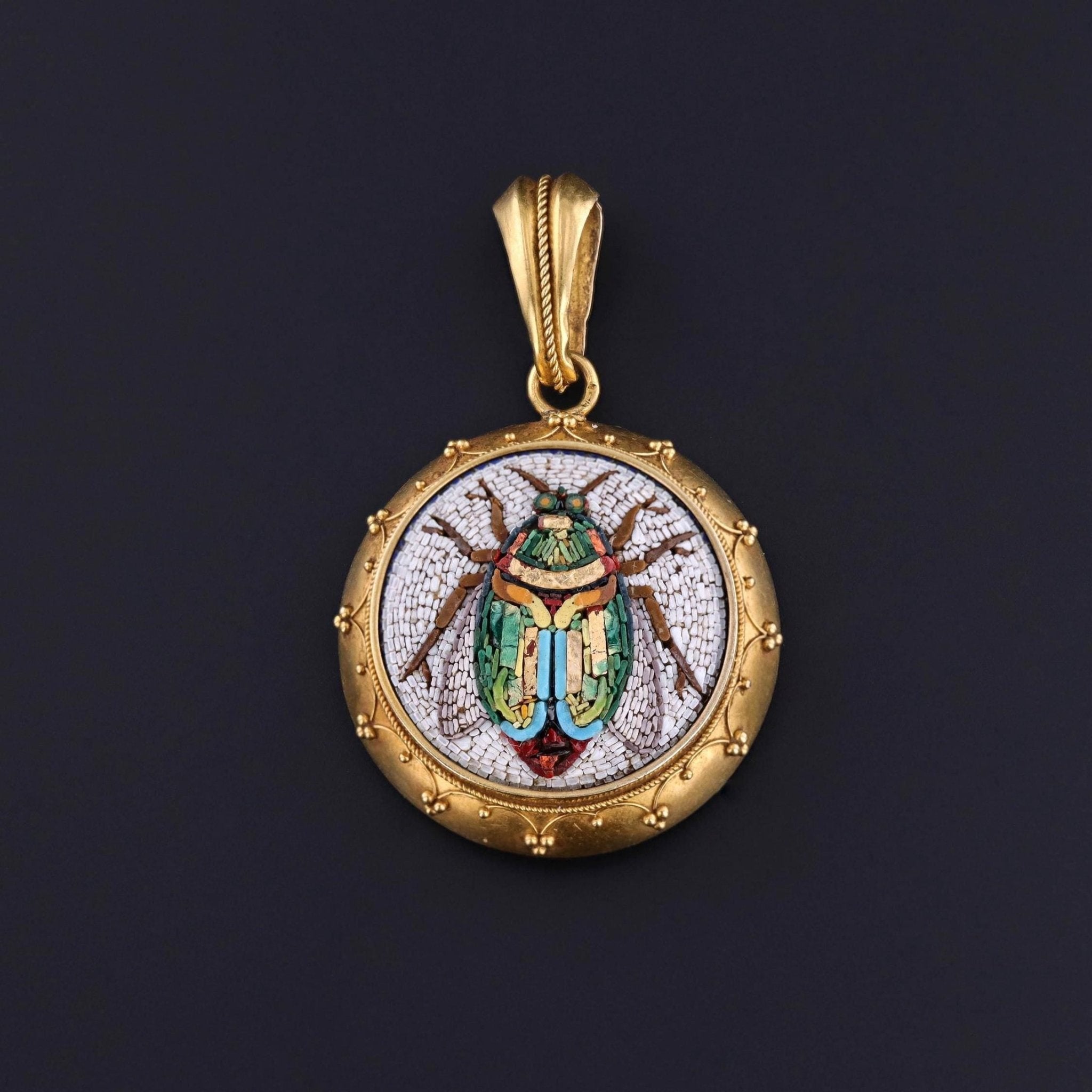 Antique Micromosaic Scarab Pendant: This antique pendant (circa 1880) features a finely crafted micromosaic scarab set in buttery 14k gold. The reverse bears a glass frame that opens as a locket.