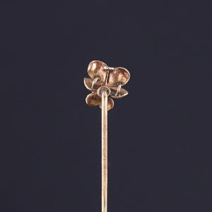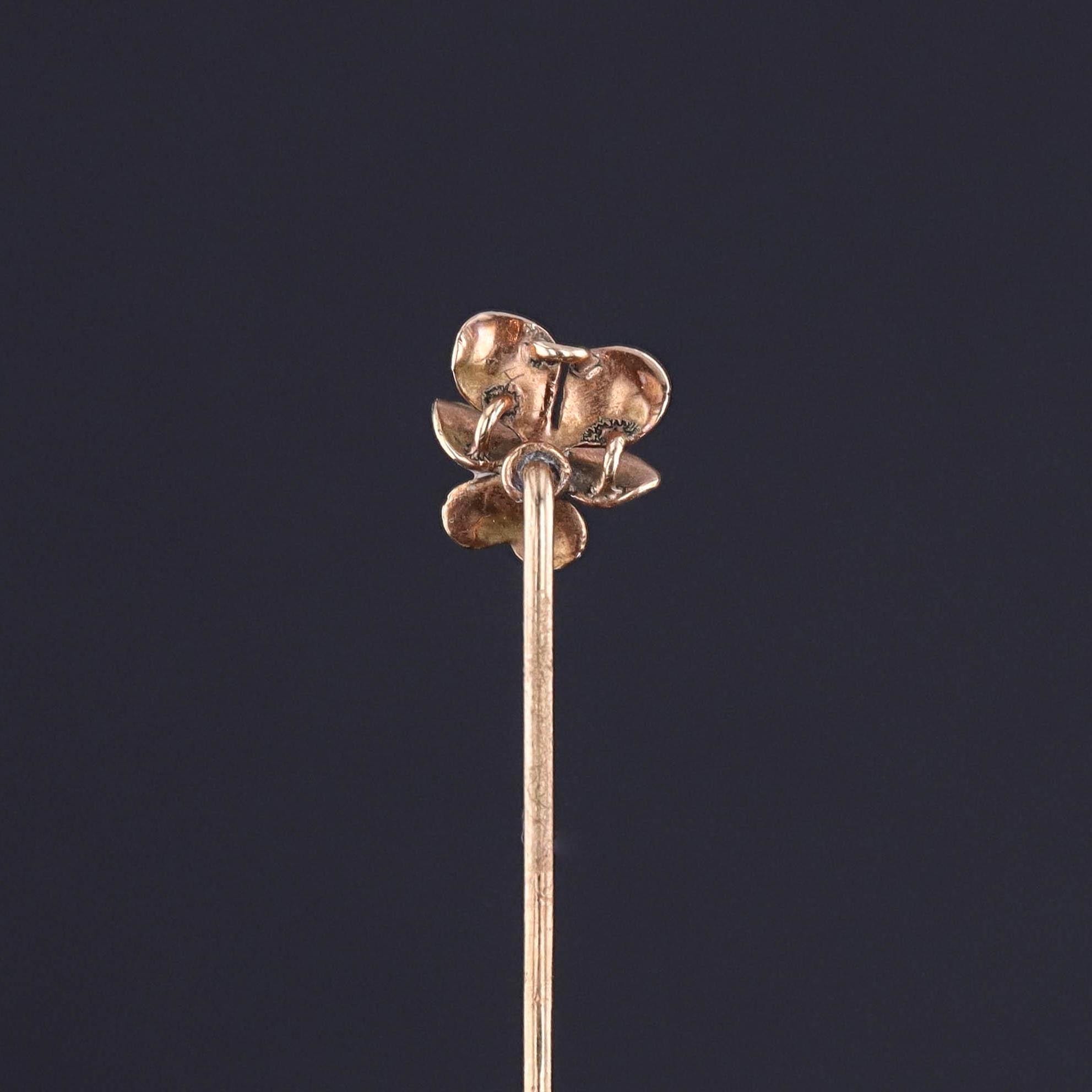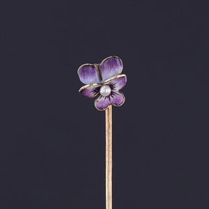 Antique Pansy Stickpin: This 14k gold stickpin (circa 1910) features a petite purple enamel pansy with a pearl accent at its center.
