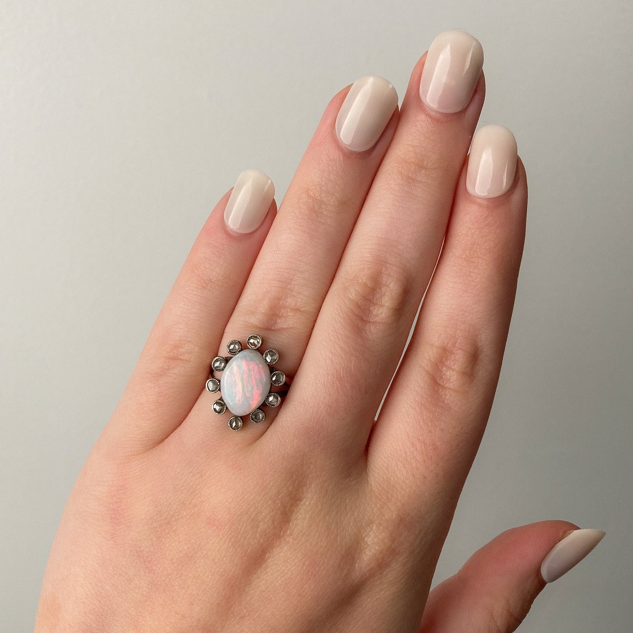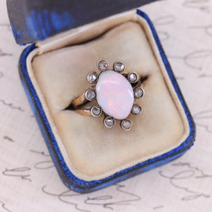 Elevate your jewelry collection with this exquisite late Victorian era ring (circa 1890). The jewel boasts a white opal with captivating orange fire encircled by glistening rose cut diamonds.