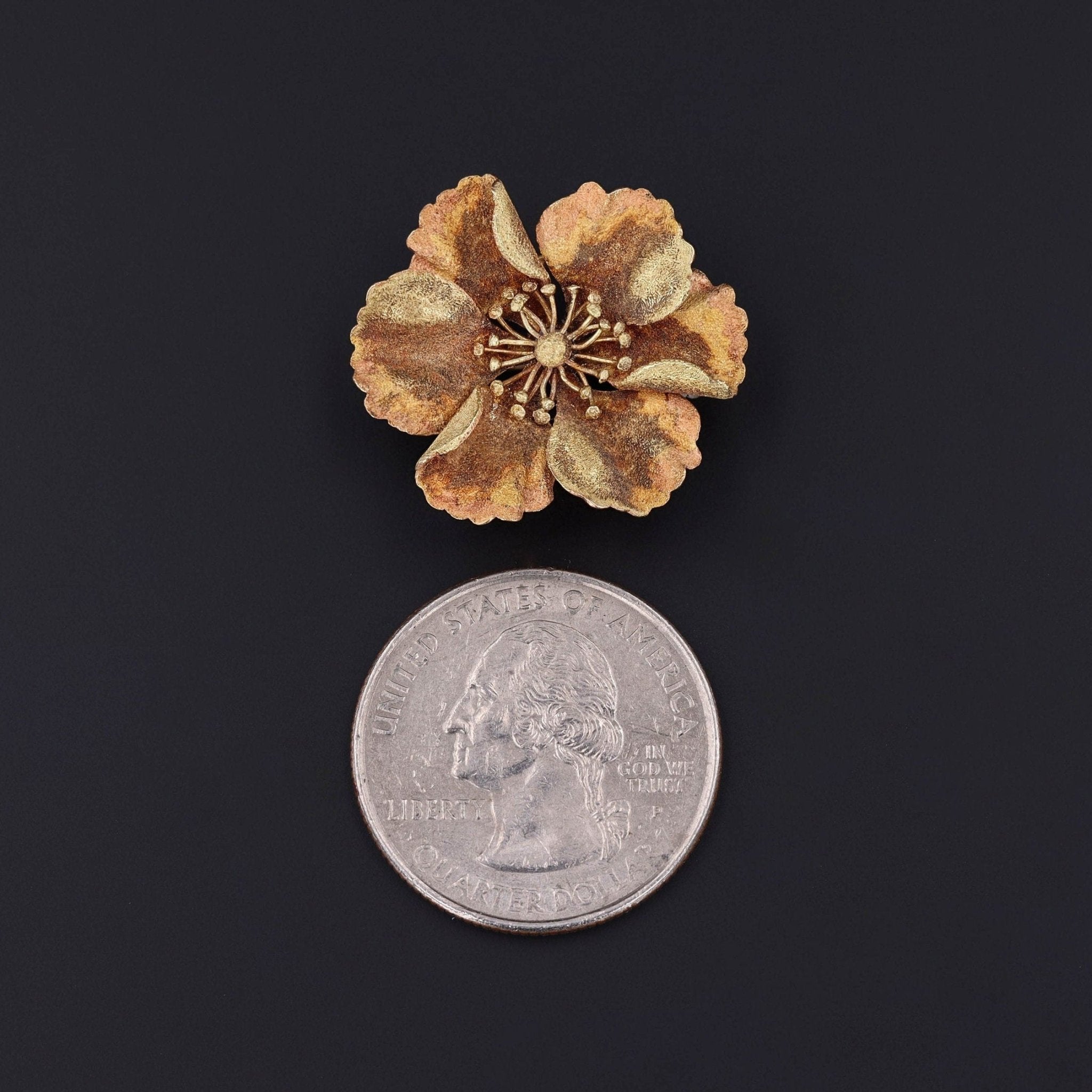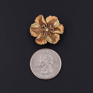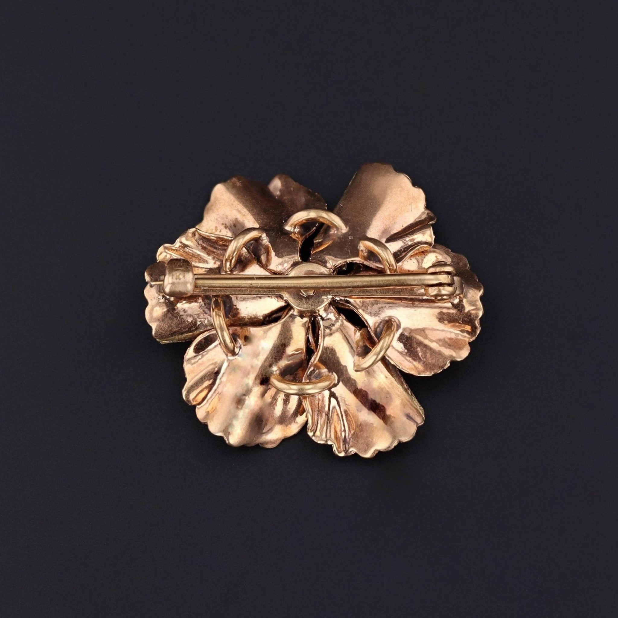 This antique brooch (circa 1910-1920) features a six petal flower of 14k gold. It bears the makers mark for AJ Hedges & Co. of Newark, New Jersey.