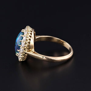 Vintage Black Opal Ring: This Art Deco ring (circa 1920-1930) features a stunning black opal set in a halo of single cut diamonds set in 18k gold. The black opal weighs approximately 2.05ct and the combined weight of the diamonds weighs 0.75ct.