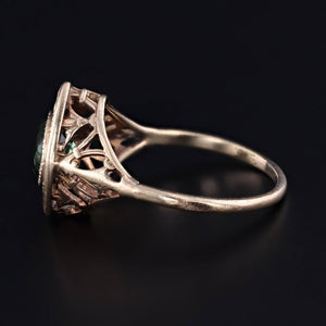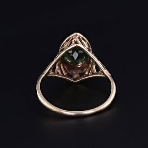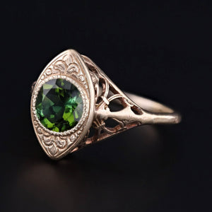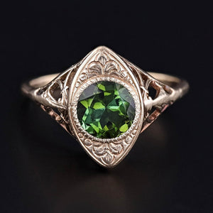 This vintage ring (circa 1920-1930) features a vibrant green tourmaline set in 10k gold yellow gold filigree.