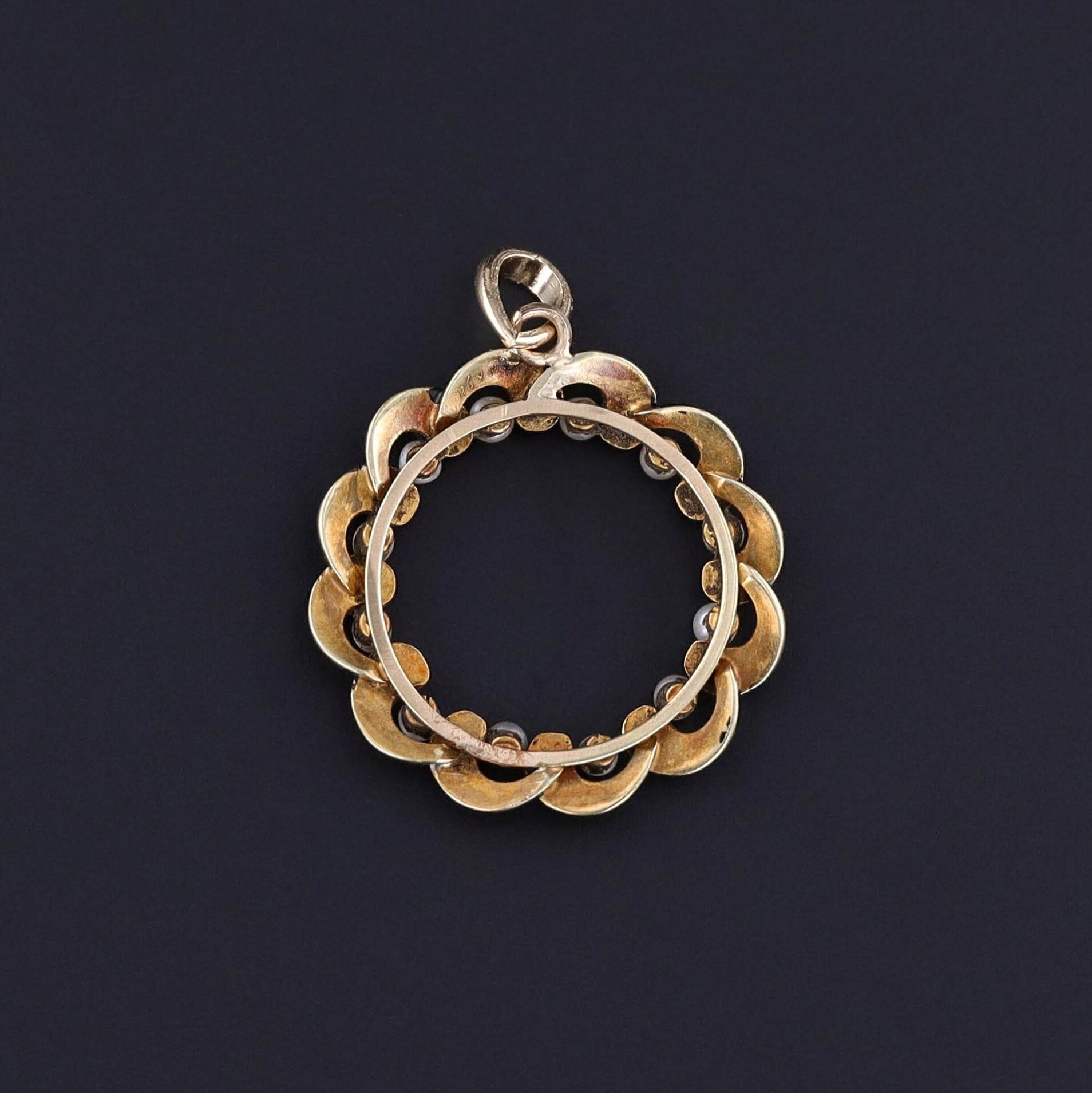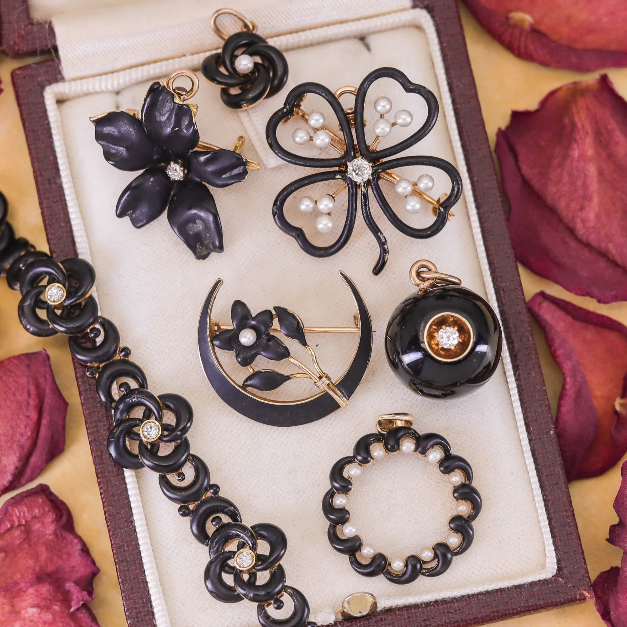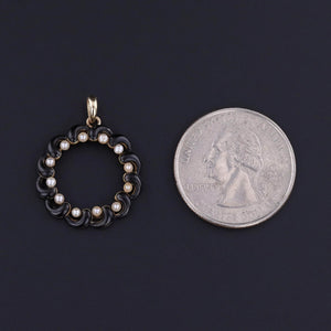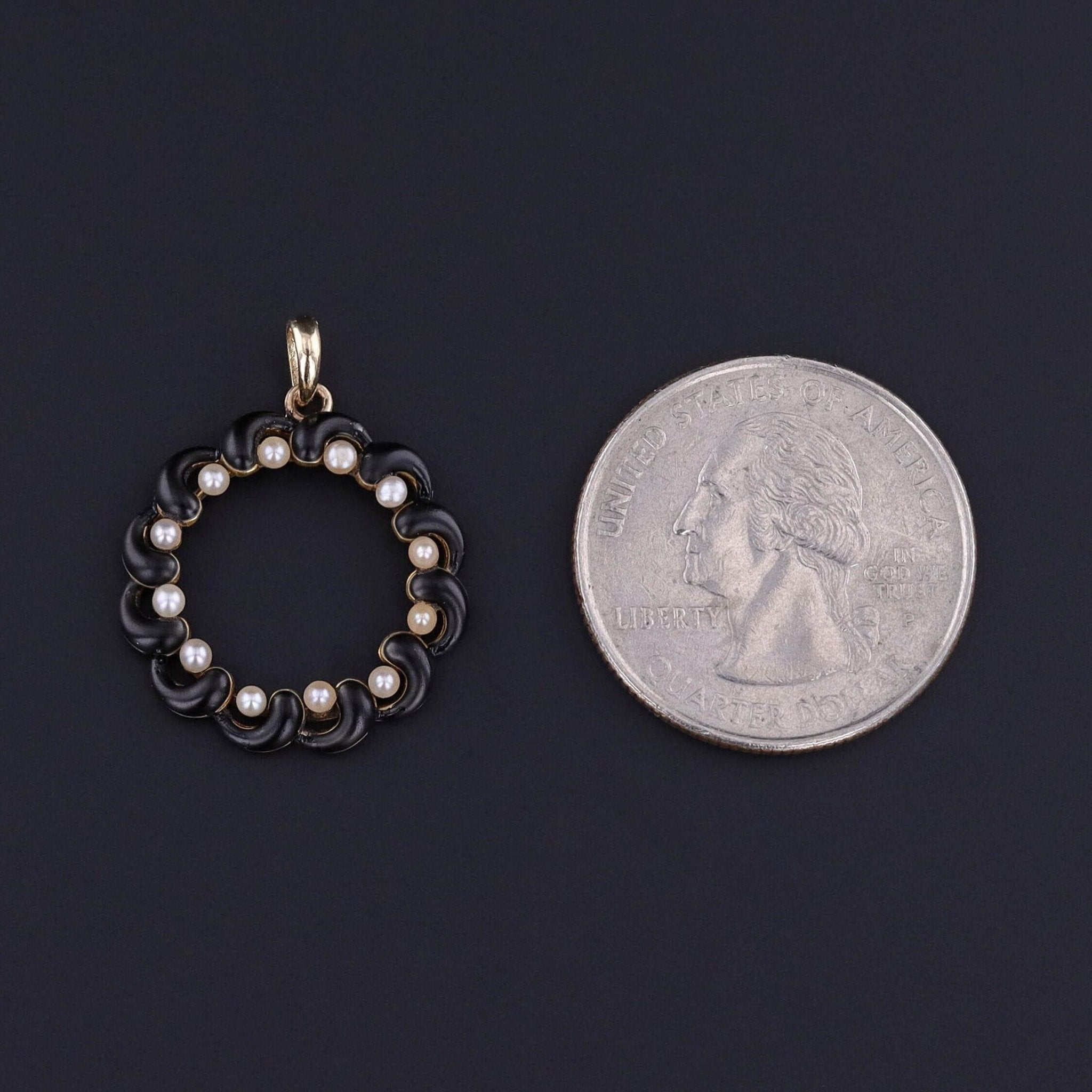 Elegant and symbolic, this antique pendant (circa 1910) began its life as a pin before being thoughtfully transformed with the addition of a 14k gold bail. The design features a black enamel wreath in 14k gold, ornamented with luminous post-set pearls — a motif traditionally associated with eternity, memory, and devotion.
