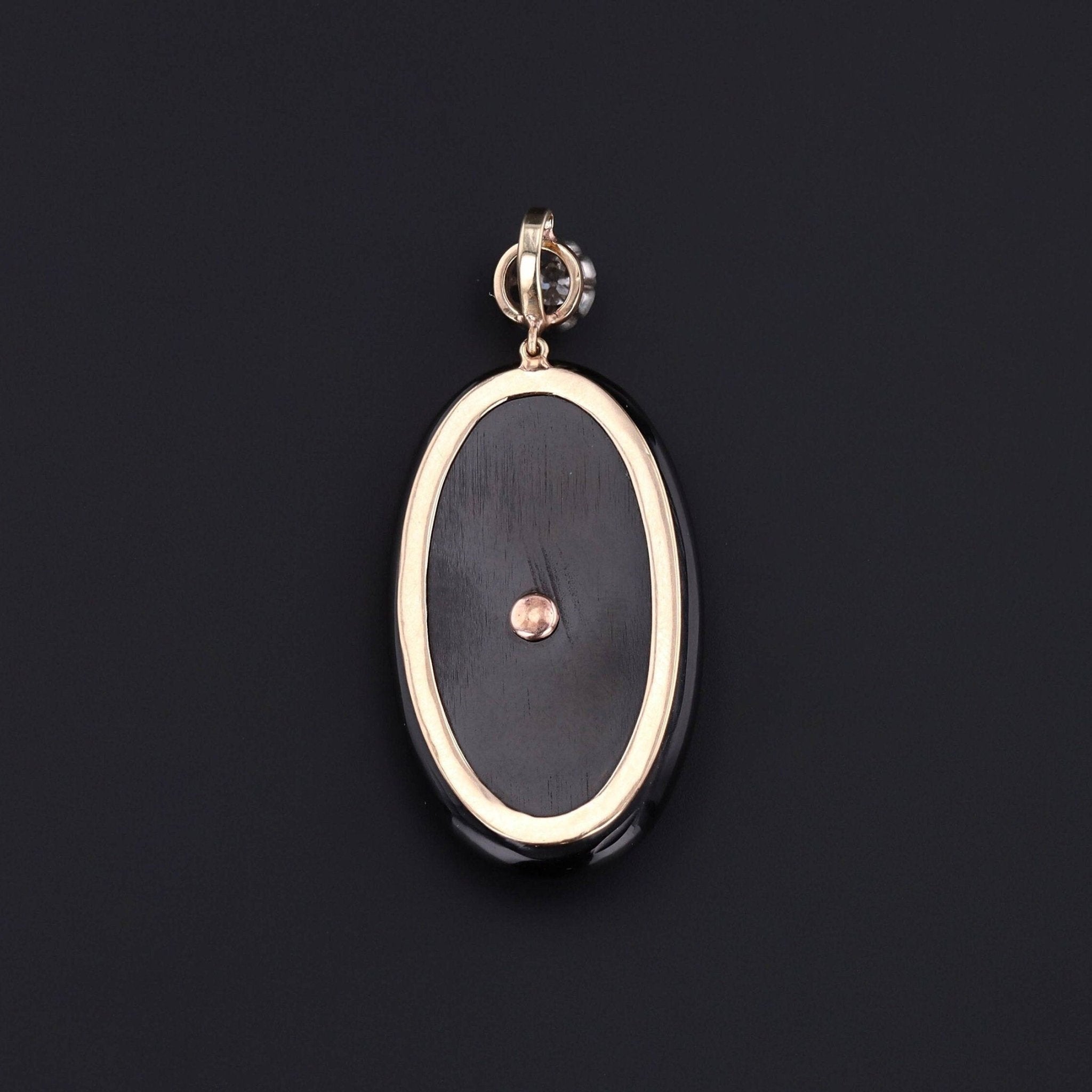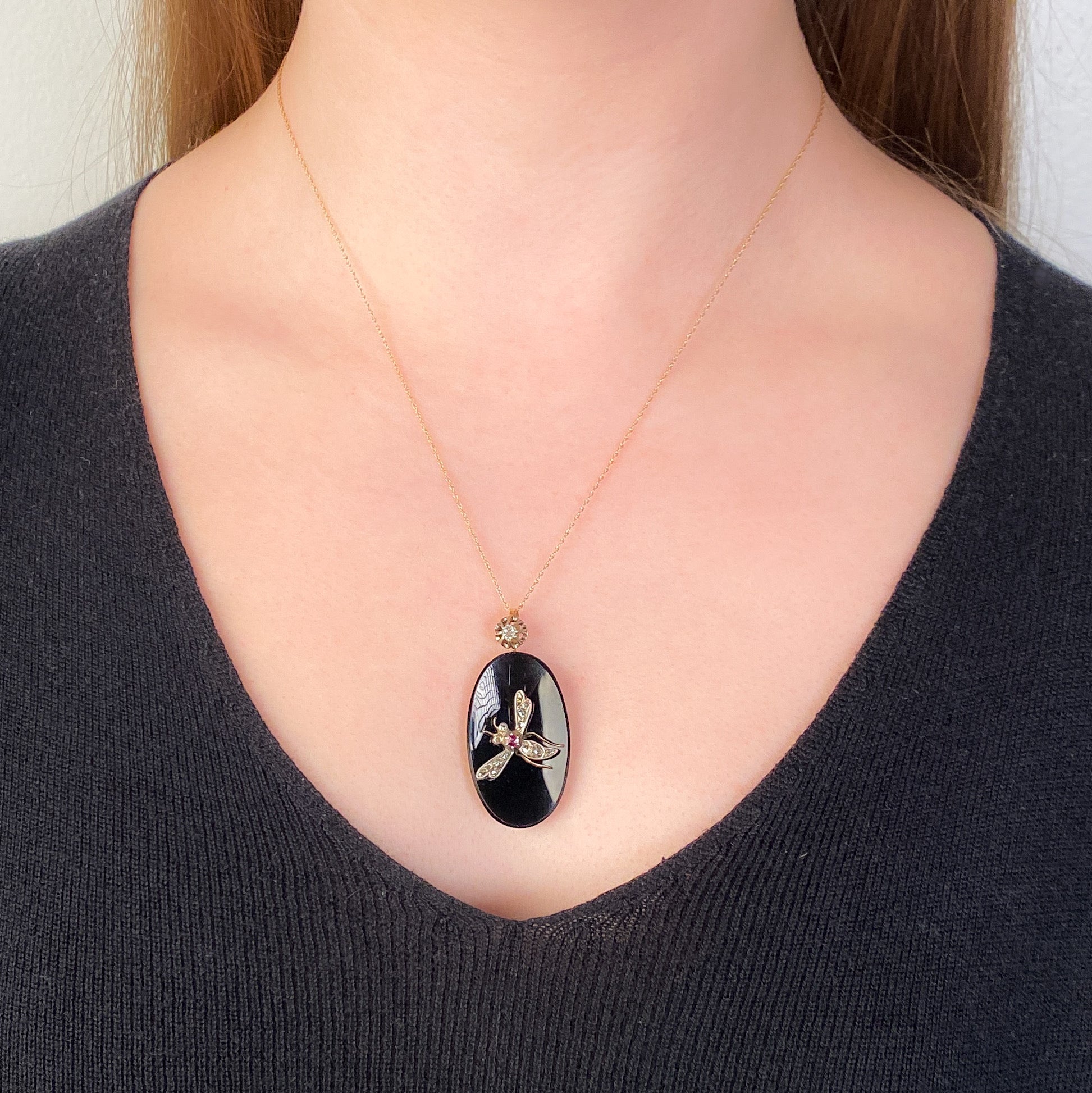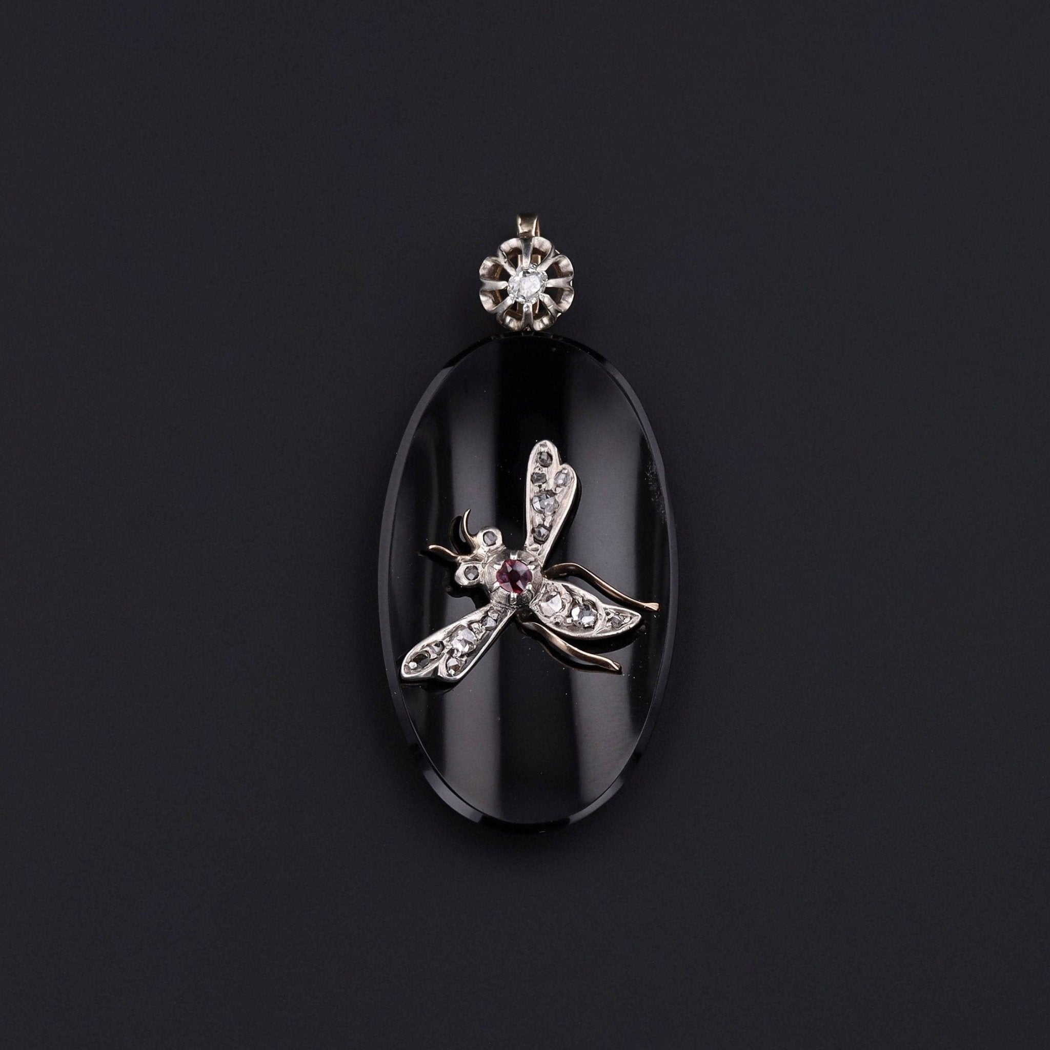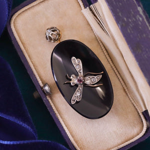 Dramatic and rare, this antique pendant (circa 1880–1900) began life as a brooch and was later converted with the addition of an antique silver-topped 14k gold bail. The jewel features a finely rendered insect in platinum, its body accented with sparkling diamonds and vivid rubies, perched atop a sleek oval onyx plaque framed in warm 14k gold.