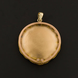 This piece was originally an antique brooch (circa 1880-1900) that we transformed by removing the pin findings and welding on a gold bail. It is 14k gold (unmarked, but acid tested) and measures 1.5 inches from top to bottom by 1.2 inches wide.