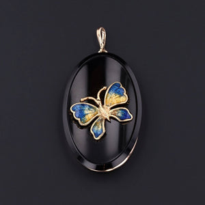 A jewel of striking contrast and beauty, this pendant features a finely detailed butterfly in 14k gold, its wings shimmering with blue and yellow enamel, poised gracefully atop a polished onyx backdrop. The dark, glossy stone enhances the luminosity of the enamel, creating a dramatic interplay of light and color.
