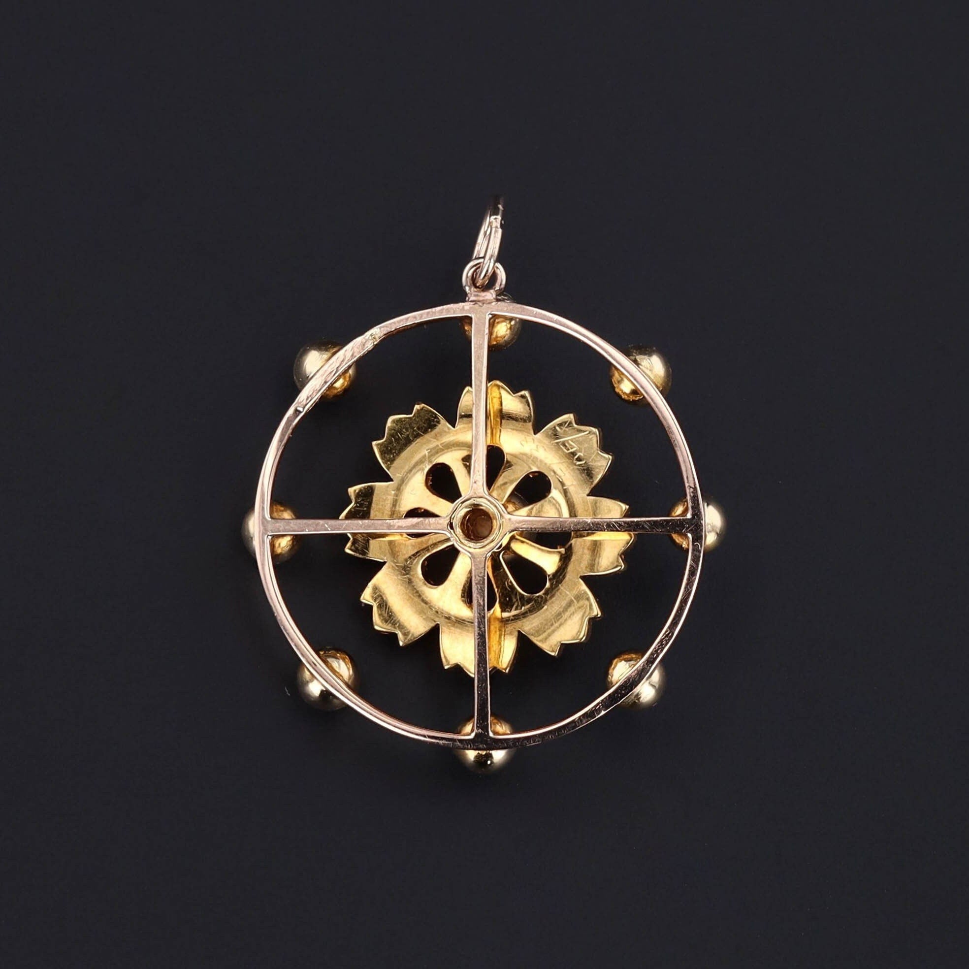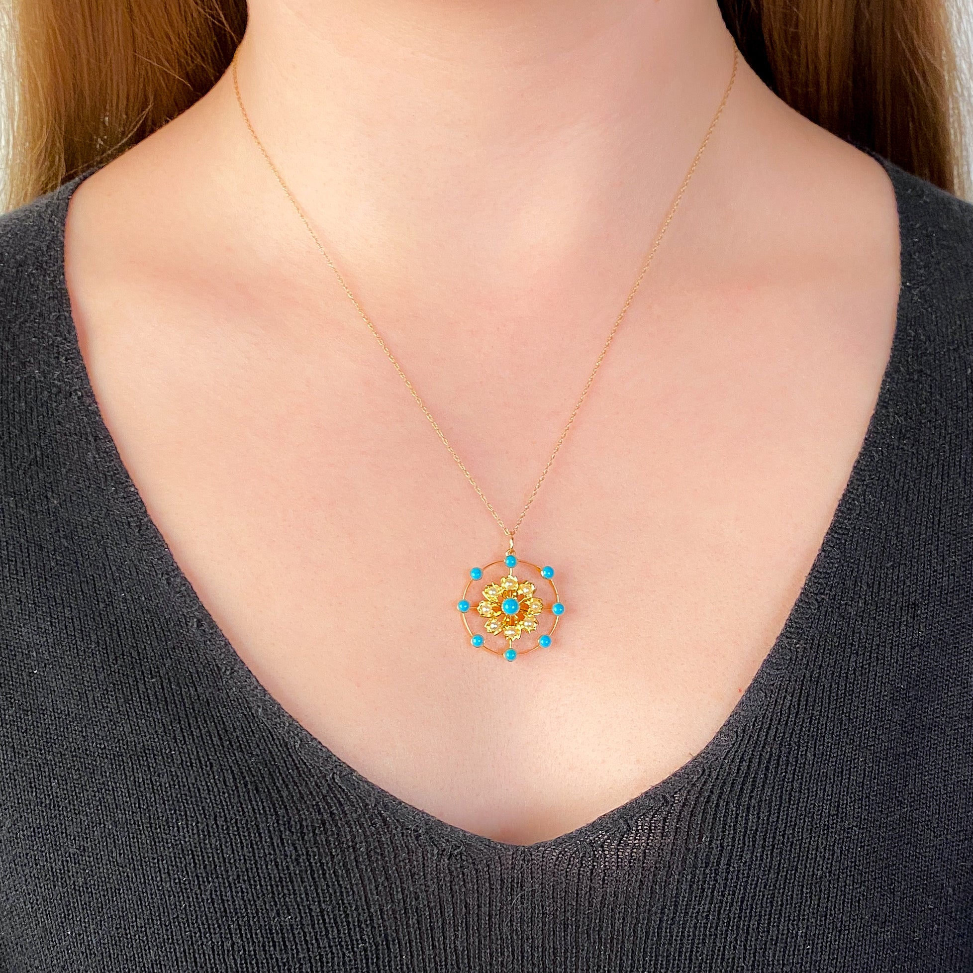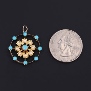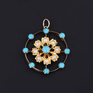 Vibrant and romantic, this antique pendant (circa 1910) was thoughtfully converted from a brooch by removing the pin findings and adding a gold jump ring bail. The jewel features a finely crafted 15ct gold flower, its petals studded with luminous pearls and encircled by a halo of vivid turquoise accents — a pairing beloved in Edwardian jewelry for its contrast and symbolism.