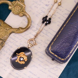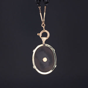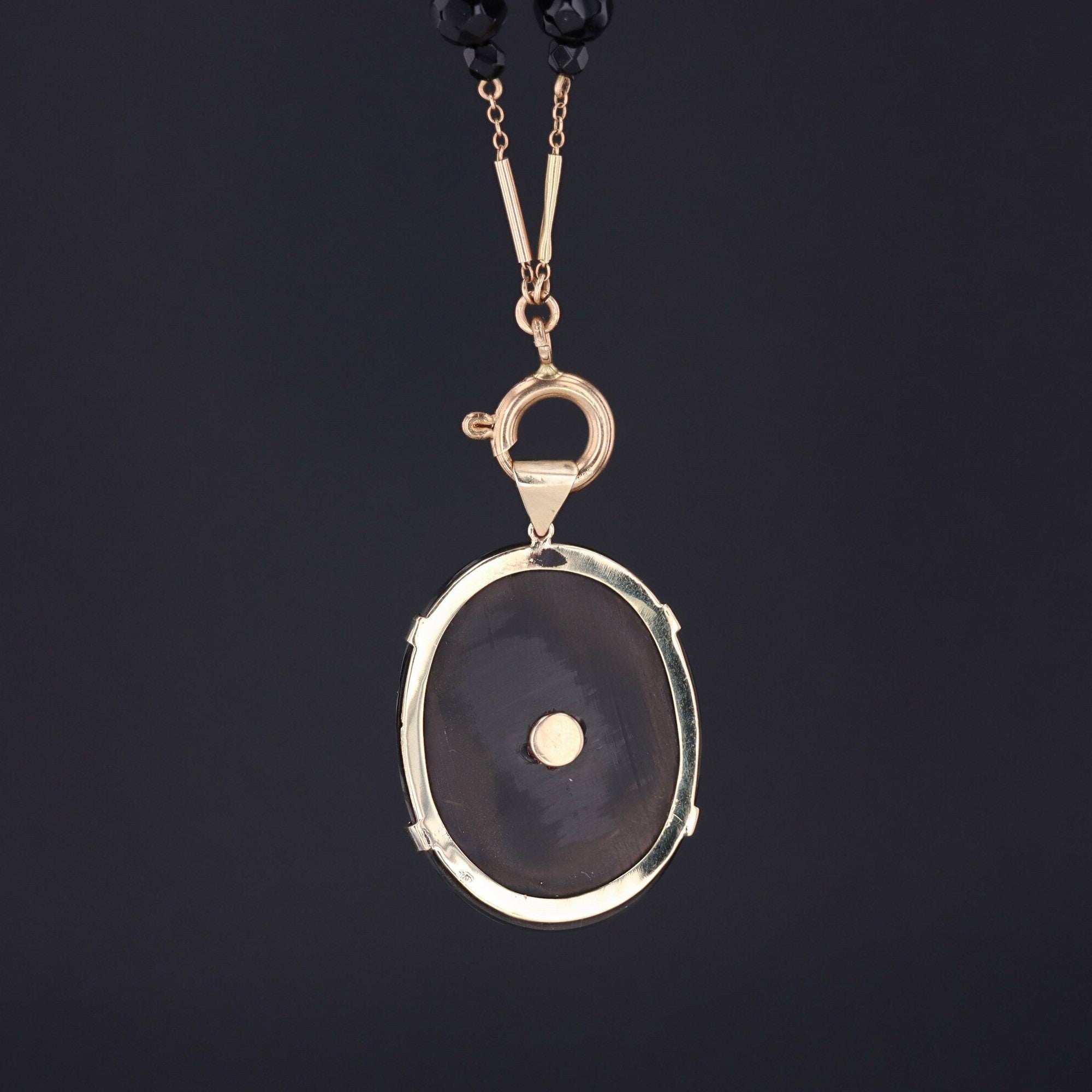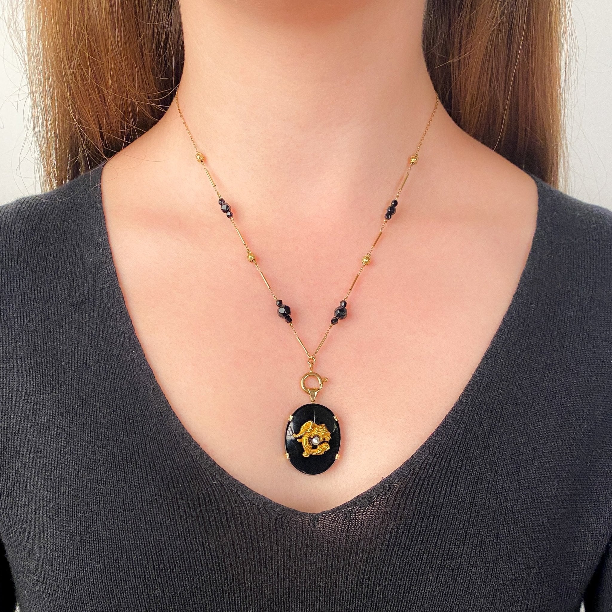 The pendant measures 1.3 inches from top to bottom by 0.95 inches across. It is offered in very good condition and is accompanied by an 18-inch 10k gold and onyx chain, creating a complete and wearable suite. The gold content has been verified through XRF (x-ray fluorescence) analysis and traditional jeweler’s acid testing, confirming purity and integrity.