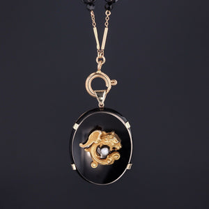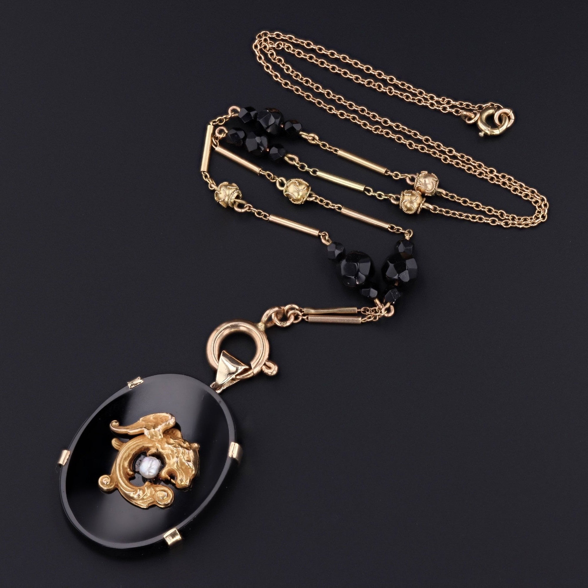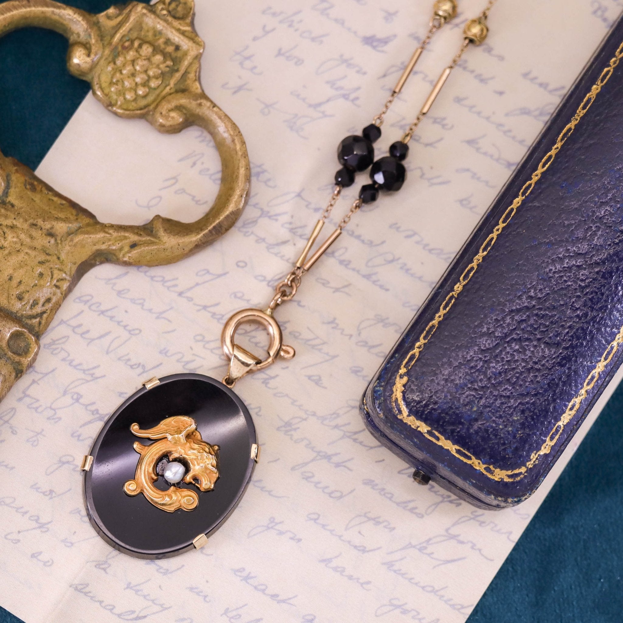 This striking pendant was originally part of an antique 14k gold bracelet (circa 1890–1900) and has been thoughtfully transformed with the addition of a 14k gold bail. The design features a finely detailed griffin—an enduring symbol of strength, courage, and protection—resting upon a polished black onyx plaque and accented with a single luminous pearl.