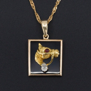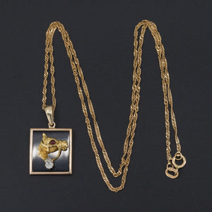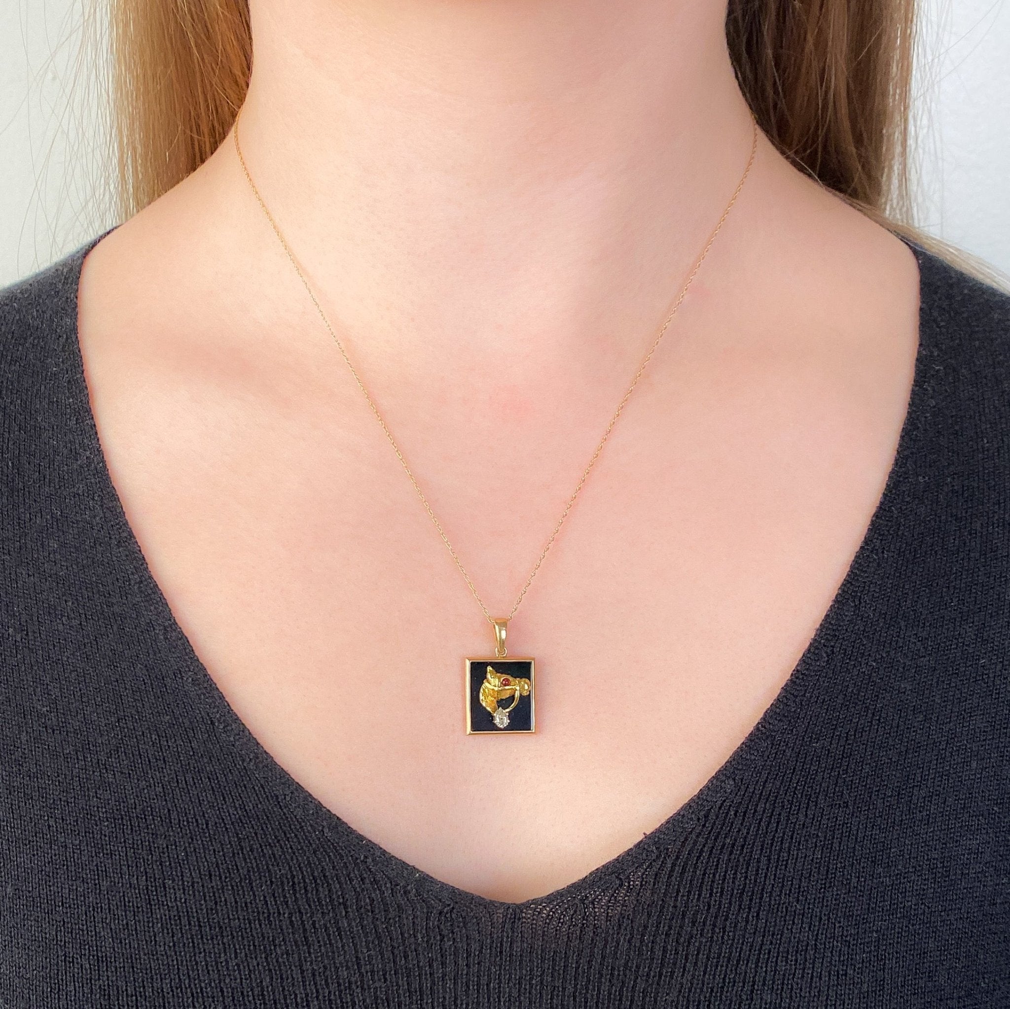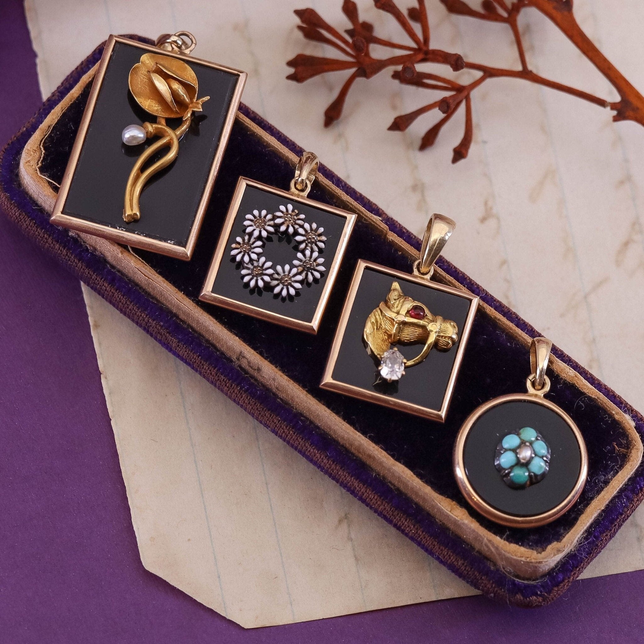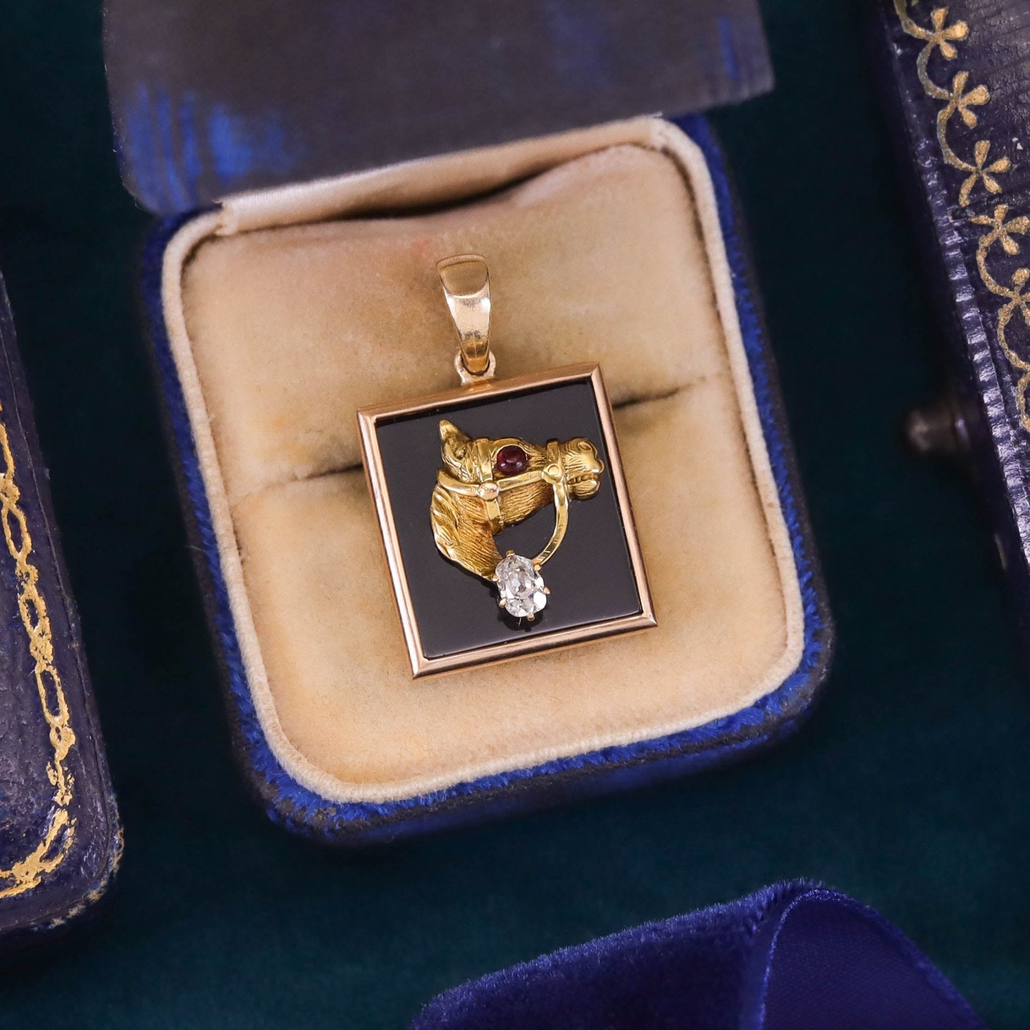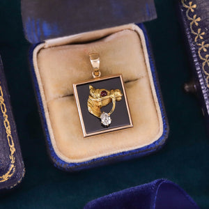 Exquisite in detail and symbolism, this antique pendant (circa 1880–1900) was thoughtfully created from a finely rendered 14k gold stickpin, now mounted on a sleek onyx plaque and framed in 14k gold.