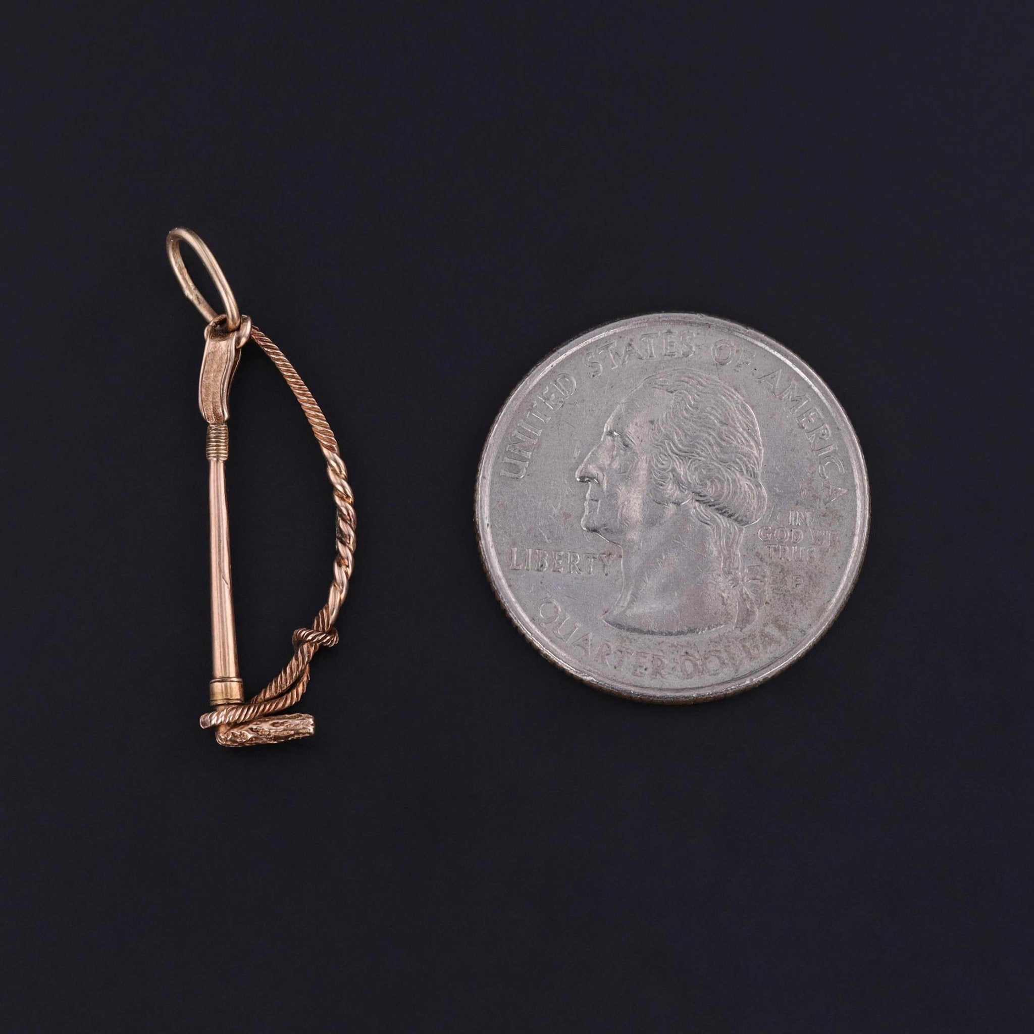 This elegant equestrian charm was originally an antique pin (circa 1910), later thoughtfully transformed for modern wear. Crafted in 14k gold, it depicts a finely modeled riding crop, a classic symbol of horsemanship and refined sporting tradition. Our jeweler carefully removed the original pin findings and added a 14k gold jump ring bail, preserving its antique character while enhancing its versatility.