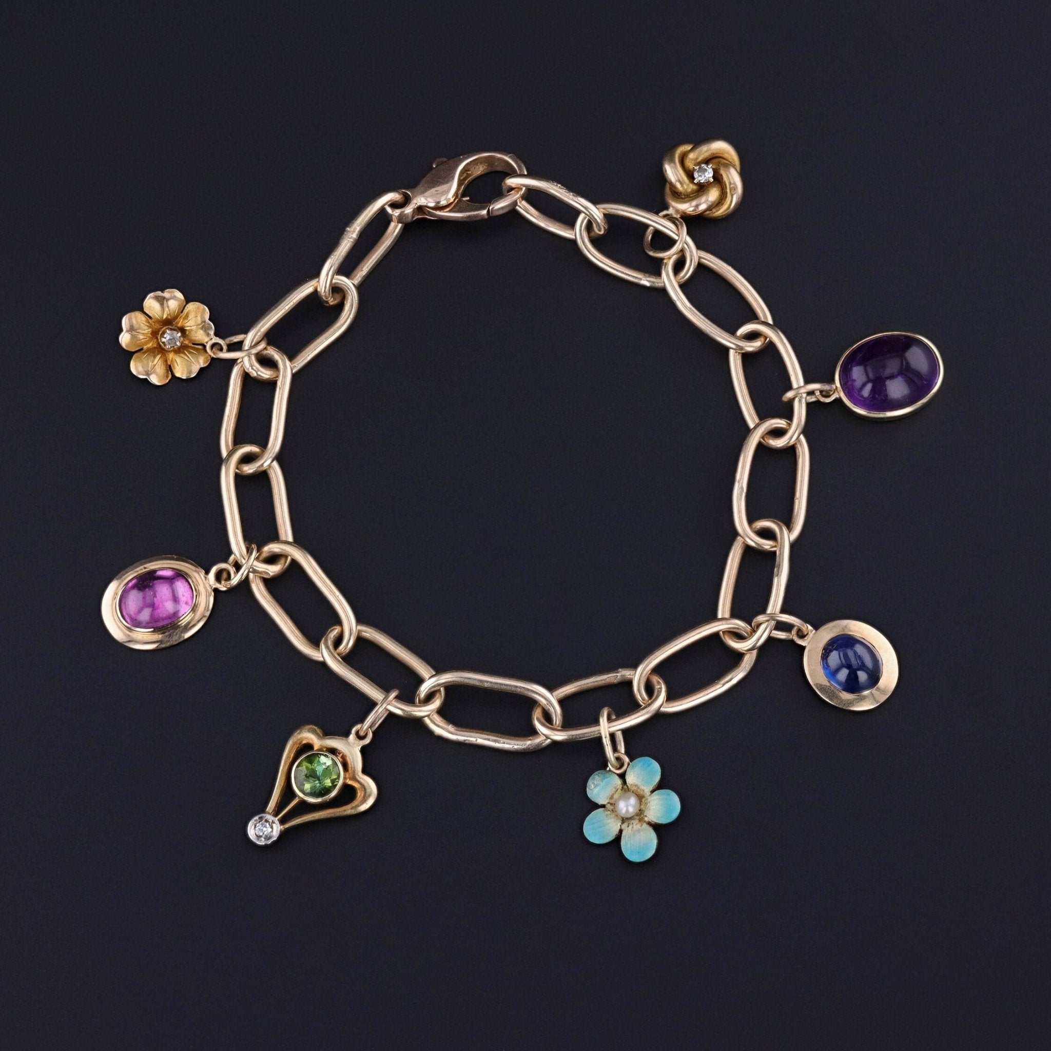 Together, the charms create a jewel rich with variety and symbolism, blending pearls, colored gemstones, enamel, and diamonds into a harmonious and elegant design.