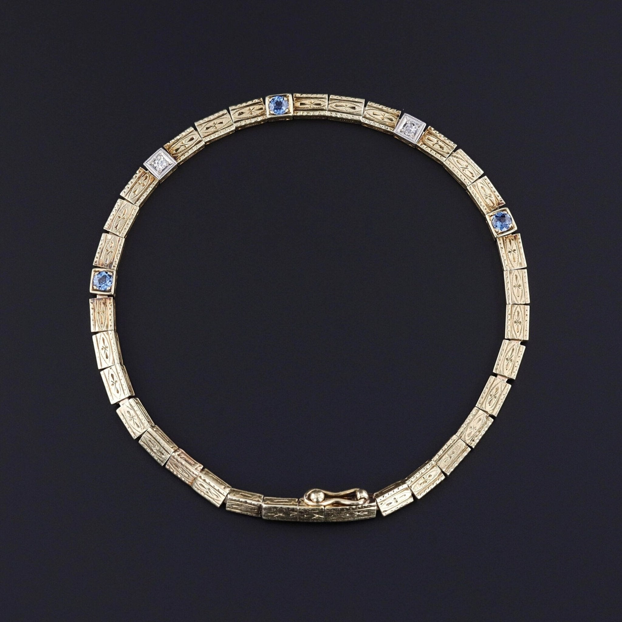 Art Deco Sapphire & Diamond Line Bracelet: Step into the elegance of the Roaring 1920s with this antique 14k yellow gold line bracelet adorned with three captivating sapphires and two glittery diamonds set in platinum.