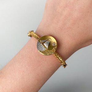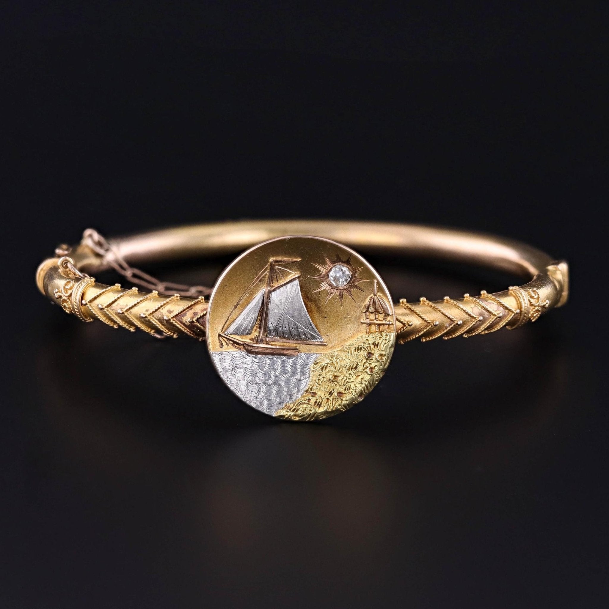 Antique Sailboat Bracelet: This 14k gold bangle (circa 1890-1900) features a tricolor gold scene of a sailboat floating on water beneath a diamond "sun."