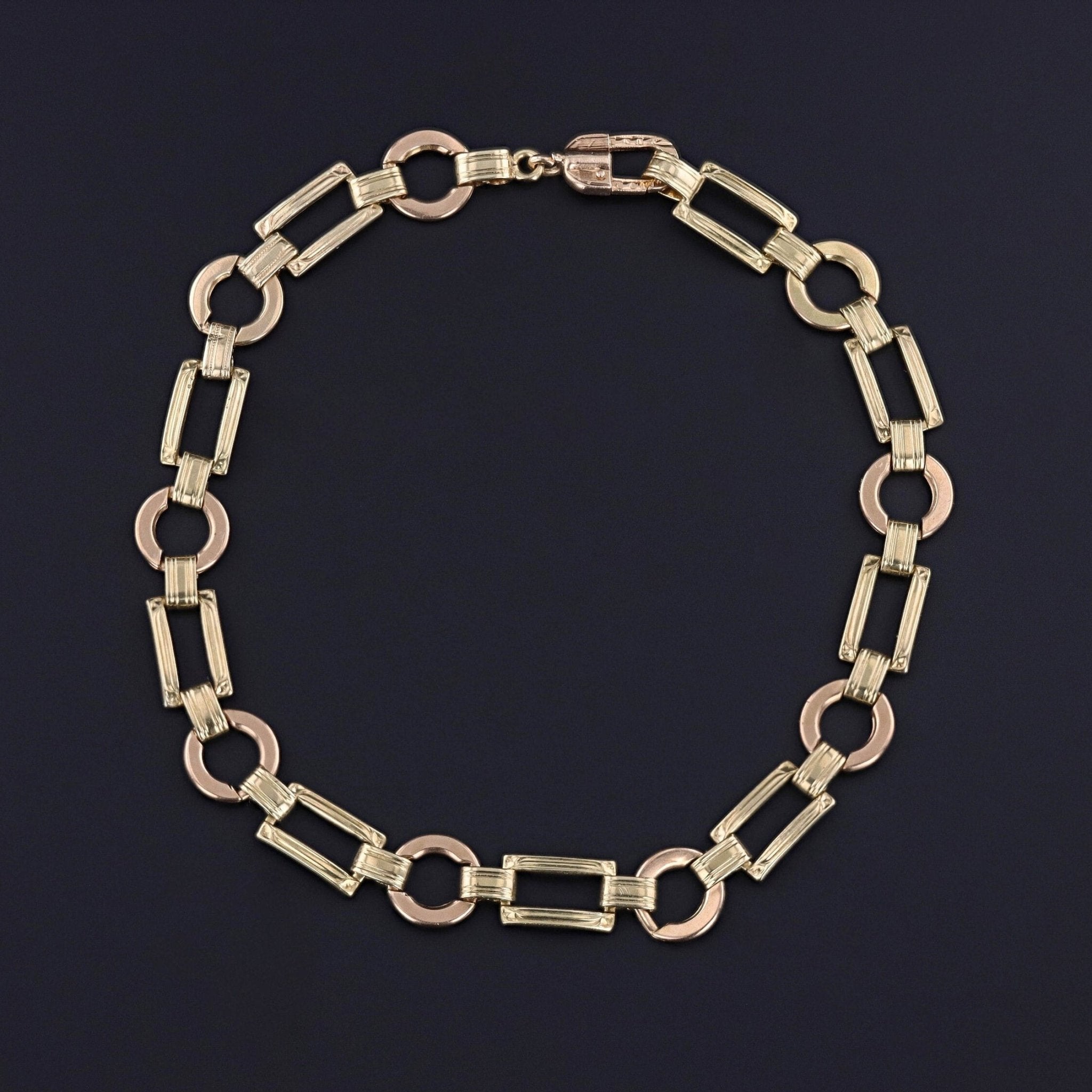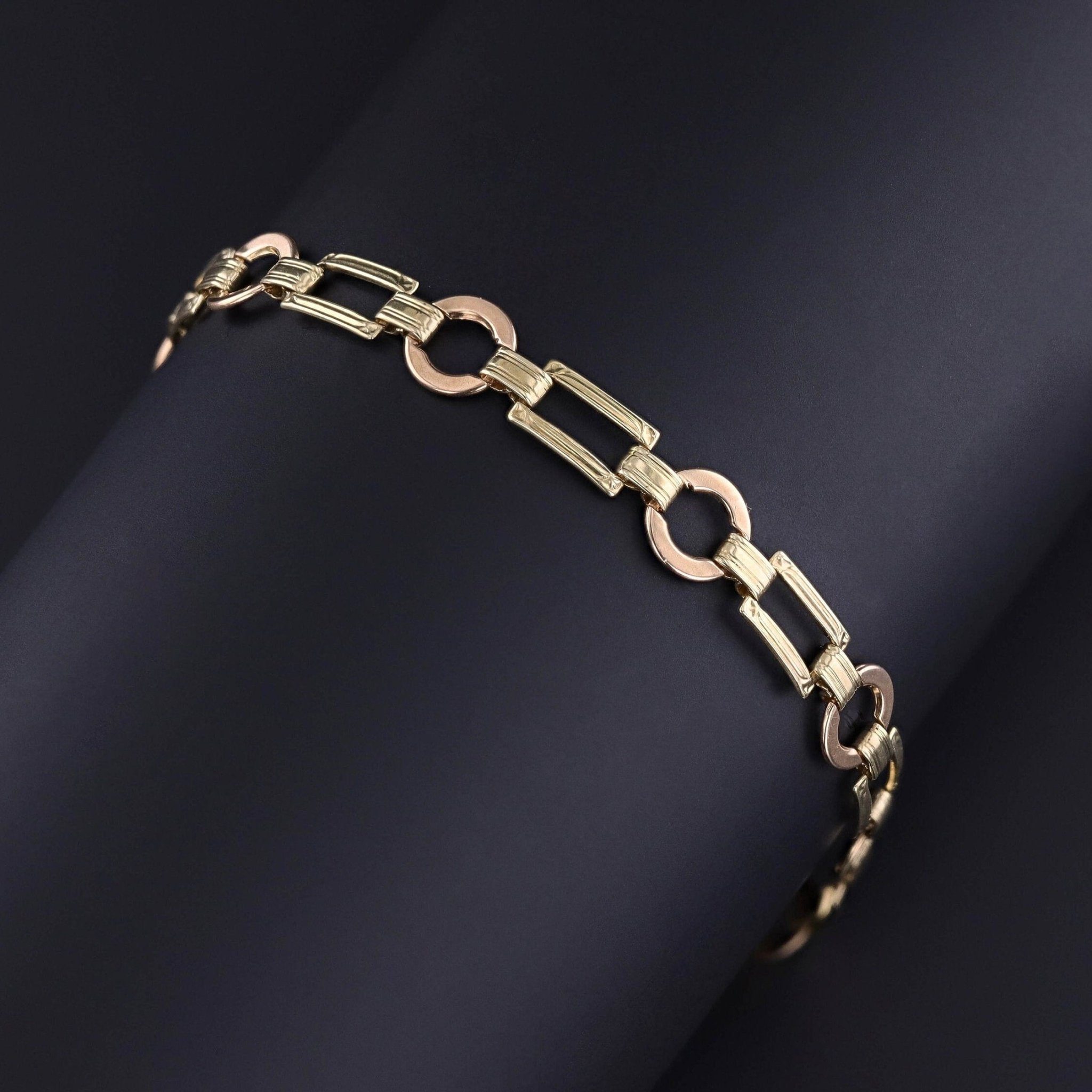 This vintage link bracelet (circa 1930) features alternating circular and rectangular links of 14k gold.