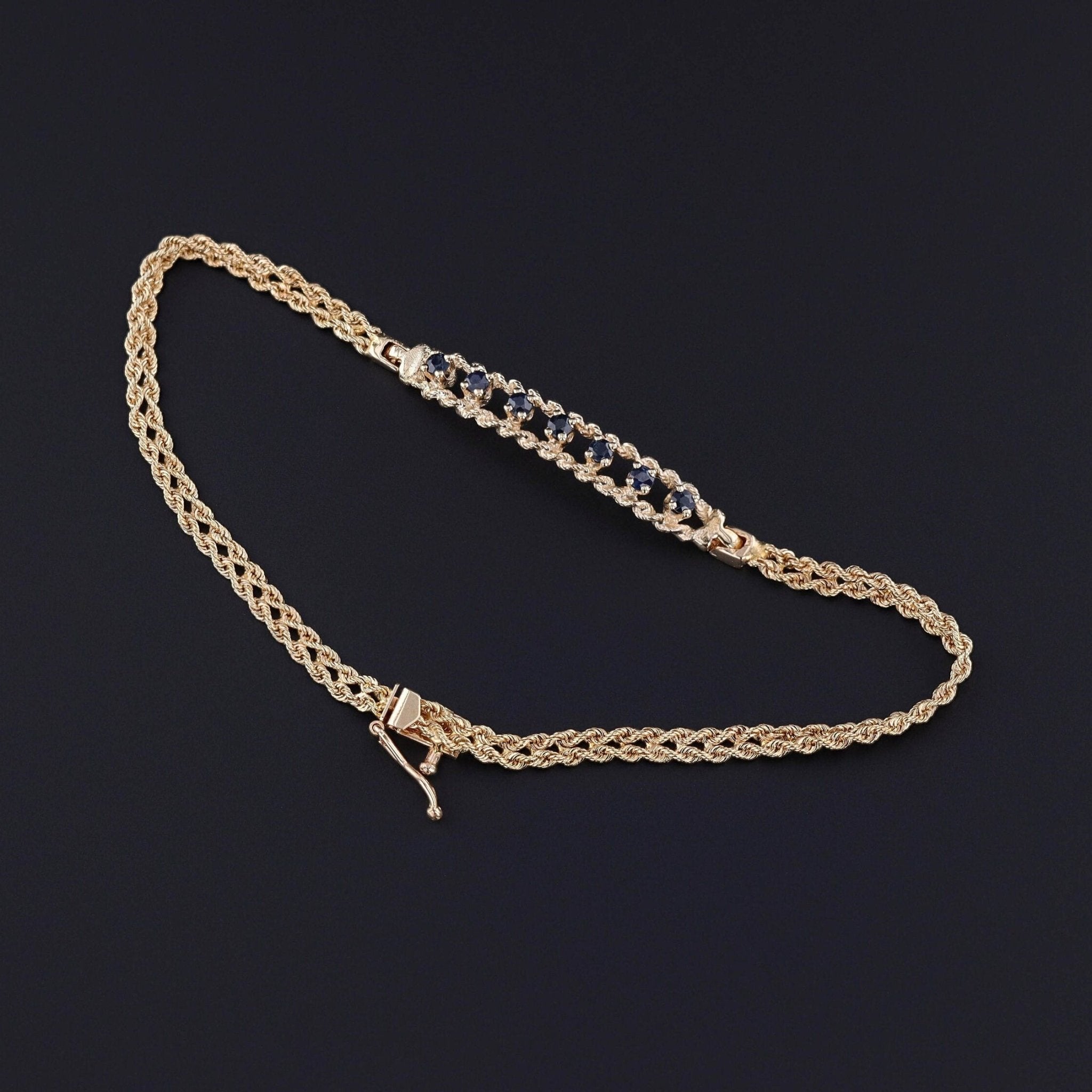 This vintage bracelet (circa 1980-1990) features a row of 7 blue sapphires set in 14k gold.