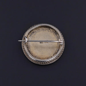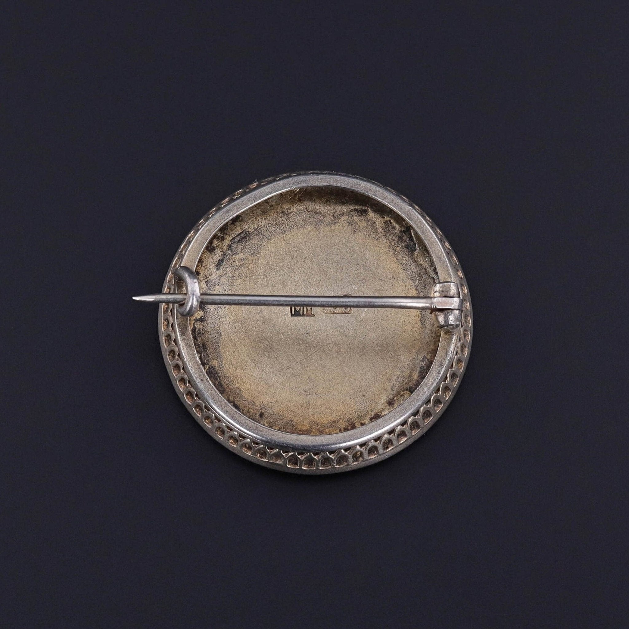 The piece is 900 silver (just slightly less silver than sterling which is 925 parts per 1000). The piece measures 1.1 inches in diameter, and it is in very good condition with some minor nibbles to the enamel around the rim.