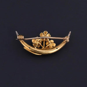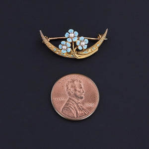 This 14k gold brooch (circa 1910) features a crescent adorned with blue and white enamel and blue enamel forget-me-not flowers with post set pearl accents. The clasp is marked for 14k and also bears the maker's mark for Krementz & Co.