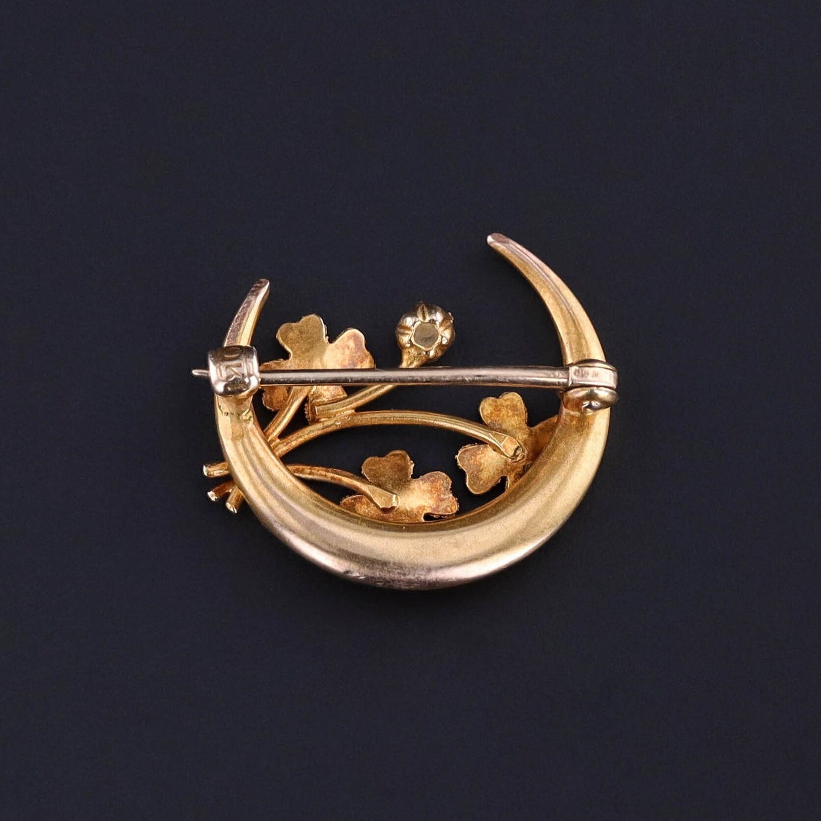 This antique brooch (circa 1890-1910) features a crescent and flowers of 10k gold with a pearl accent.