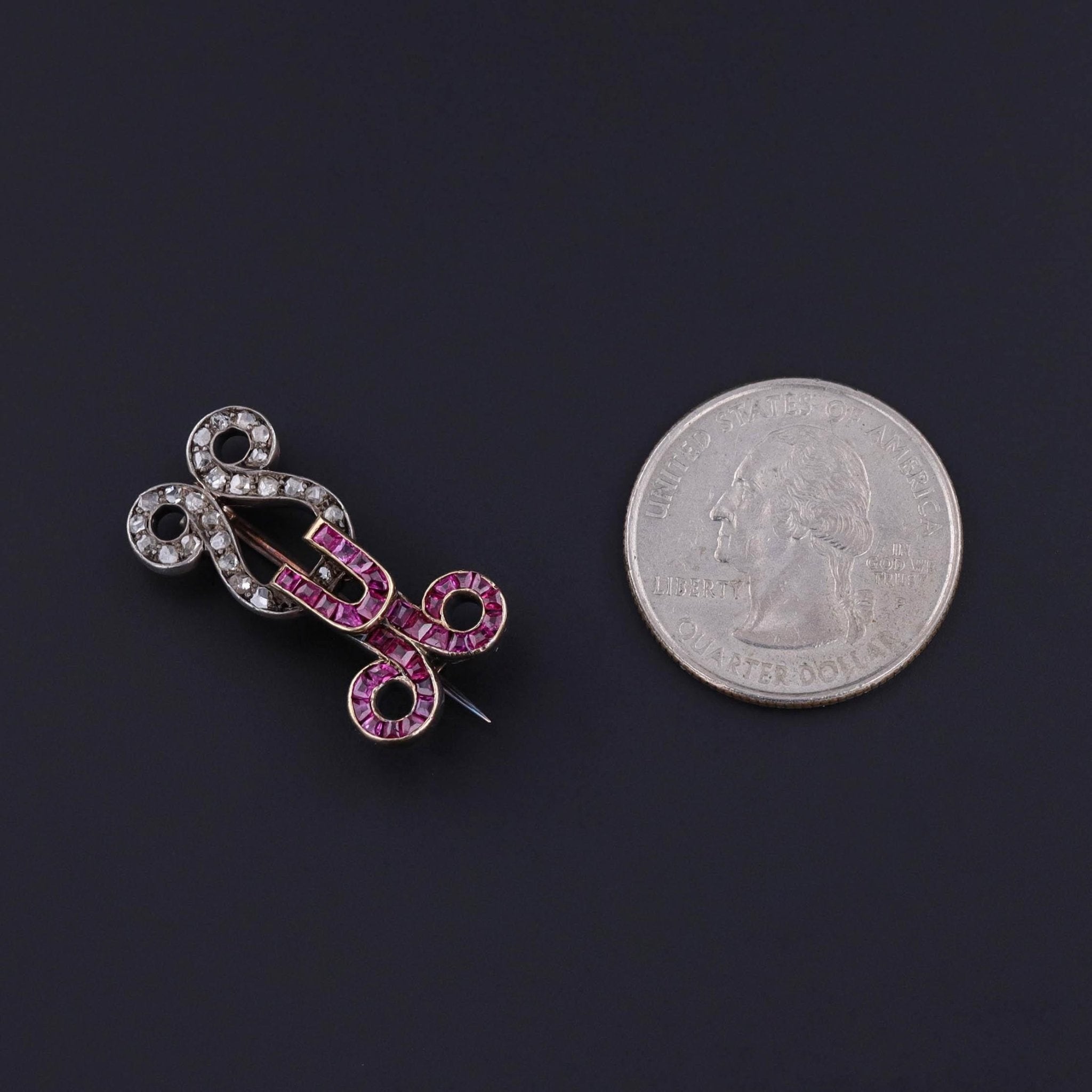 A rare Victorian treasure, this ingenious “hook and latch” motif brooch fuses symbolism and sophistication. The hook glistens with rich red rubies, while the latch sparkles with old cut diamonds, both set in warm 12ct gold—a striking blend of color and contrast emblematic of 19th-century design ingenuity.
