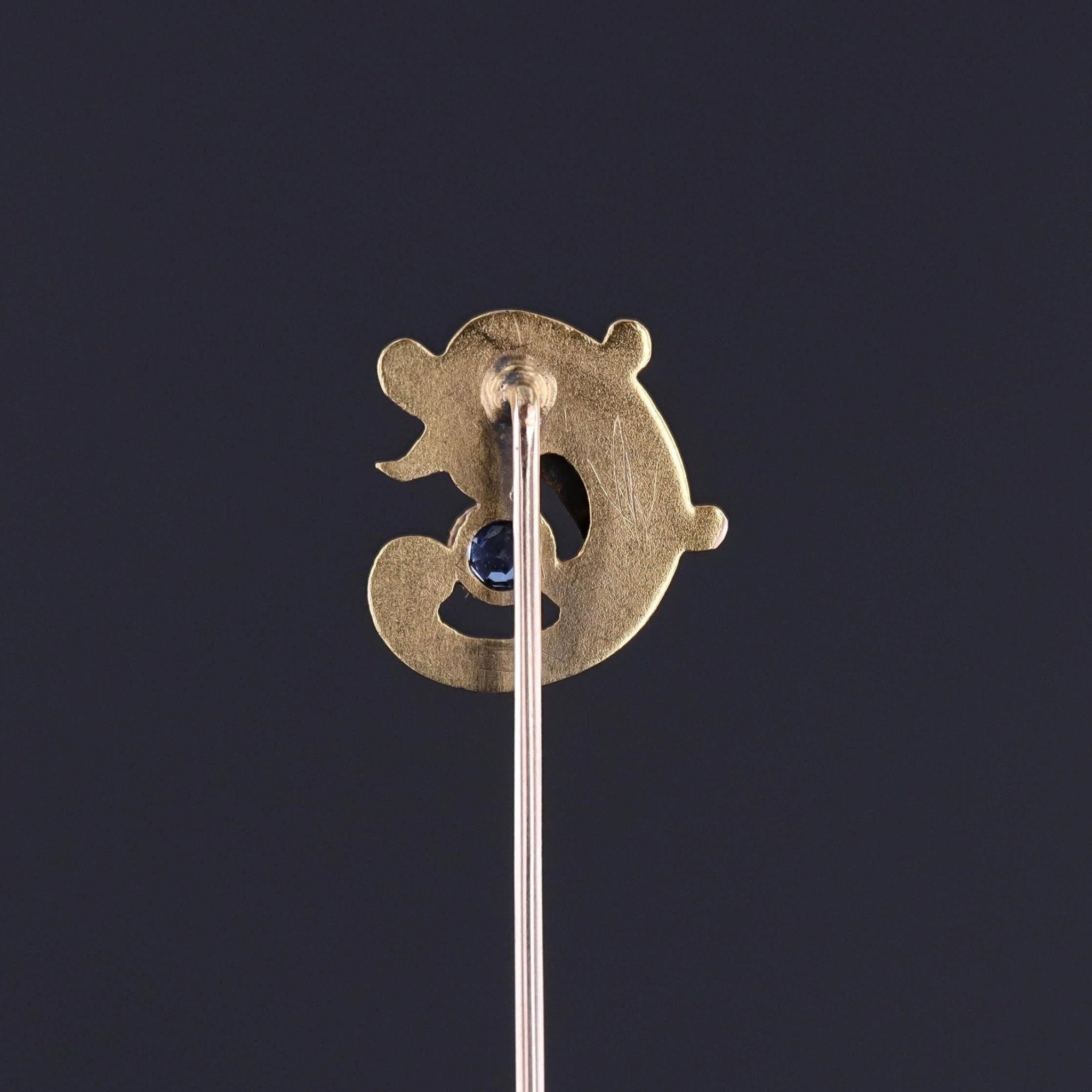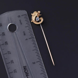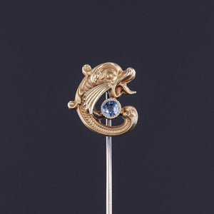 Antique Fish Stickpin: This antique stickpin (circa 1890-1900) features a sea creature of 14k gold with a natural blue sapphire accent.