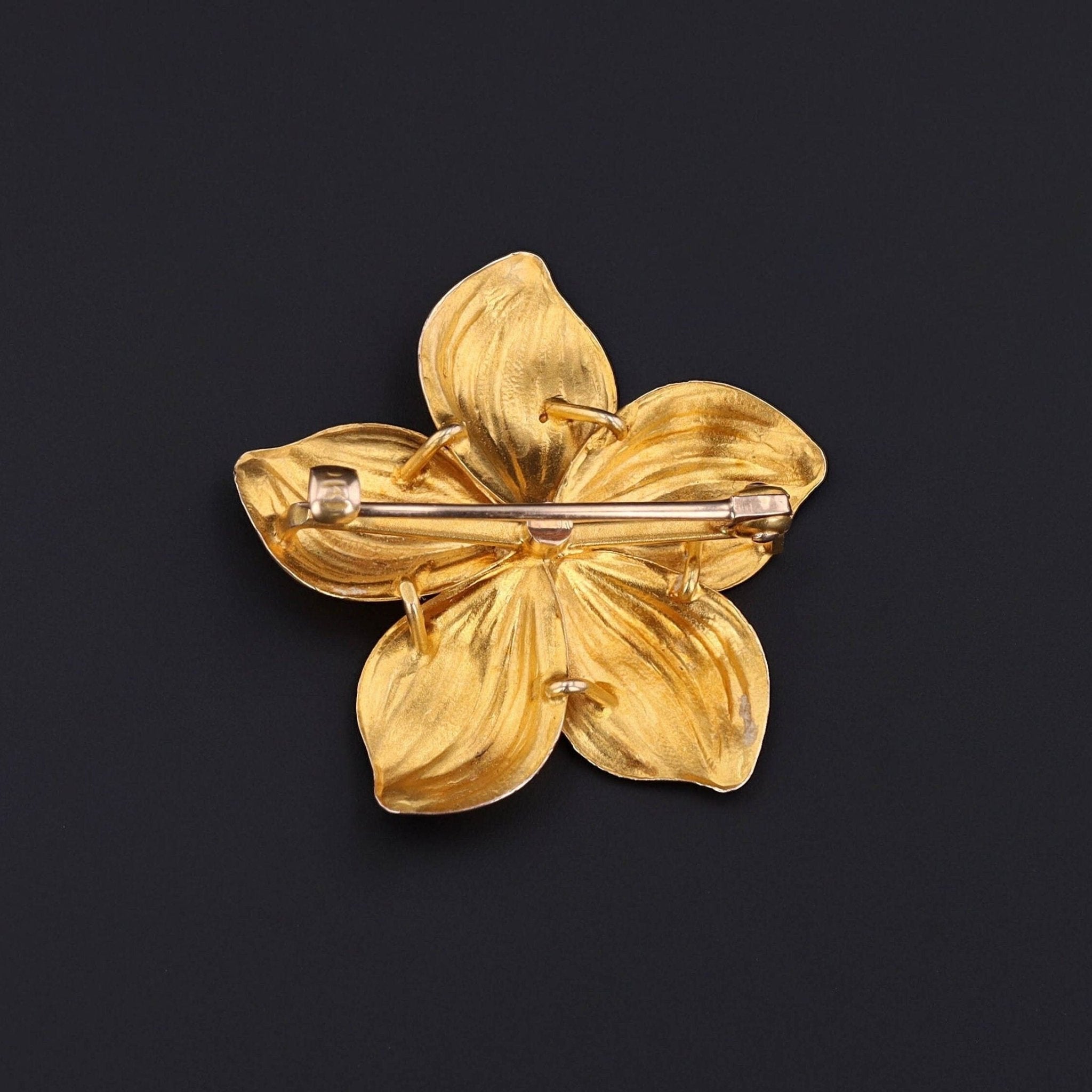 This antique brooch (circa 1900-1910) features a five petal flower of 14k gold with a single pearl accent.