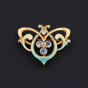This antique 14k gold brooch (circa 1900) is adorned in lustrous blue green enamel and accented by three sapphires and a single diamond.
