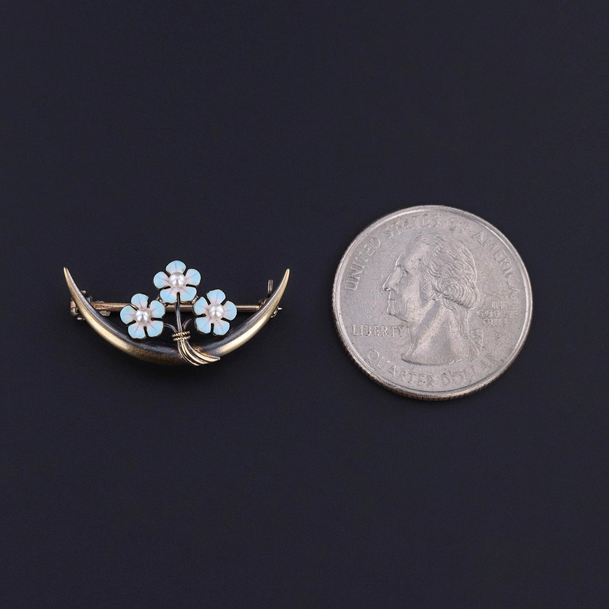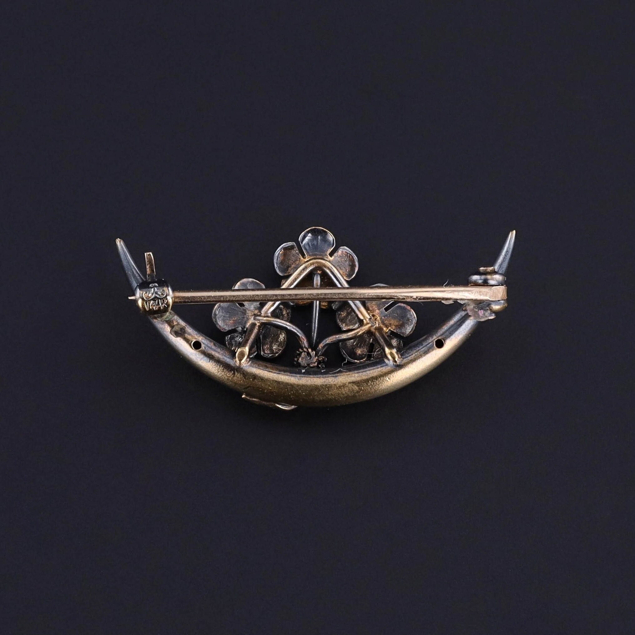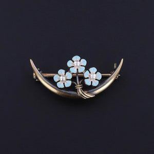 This antique 14k gold brooch (circa 1910) features a crescent of blue forget-me-not flowers with pearl accents. The pin catch bears the makers mark for Krementz & Co. of Newark, NJ.